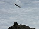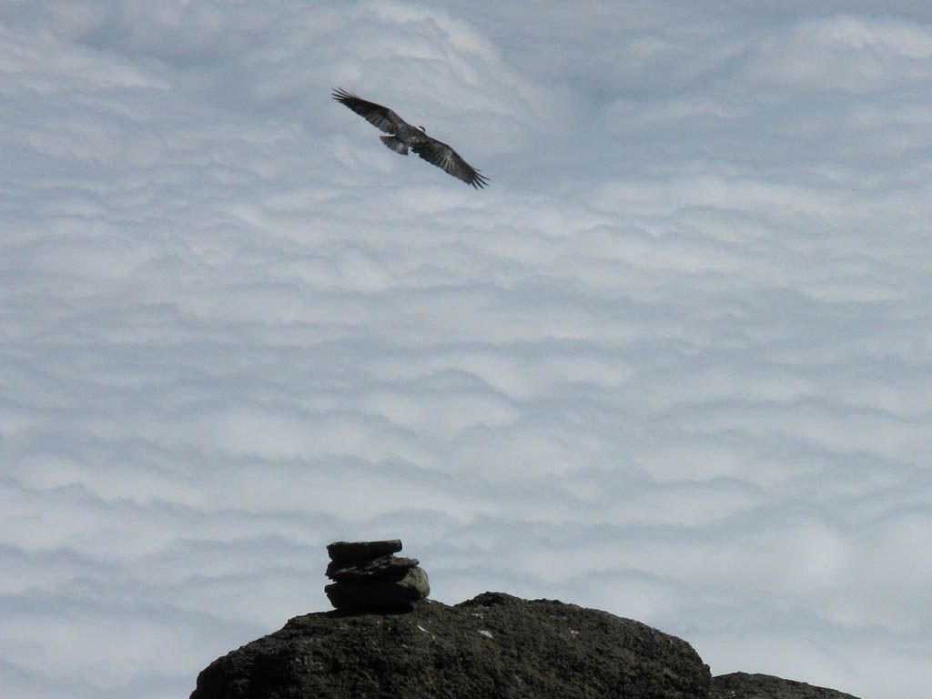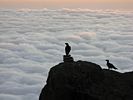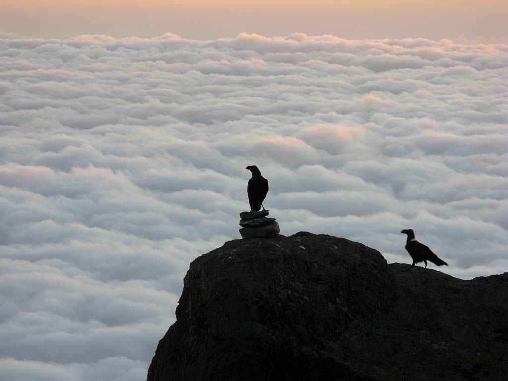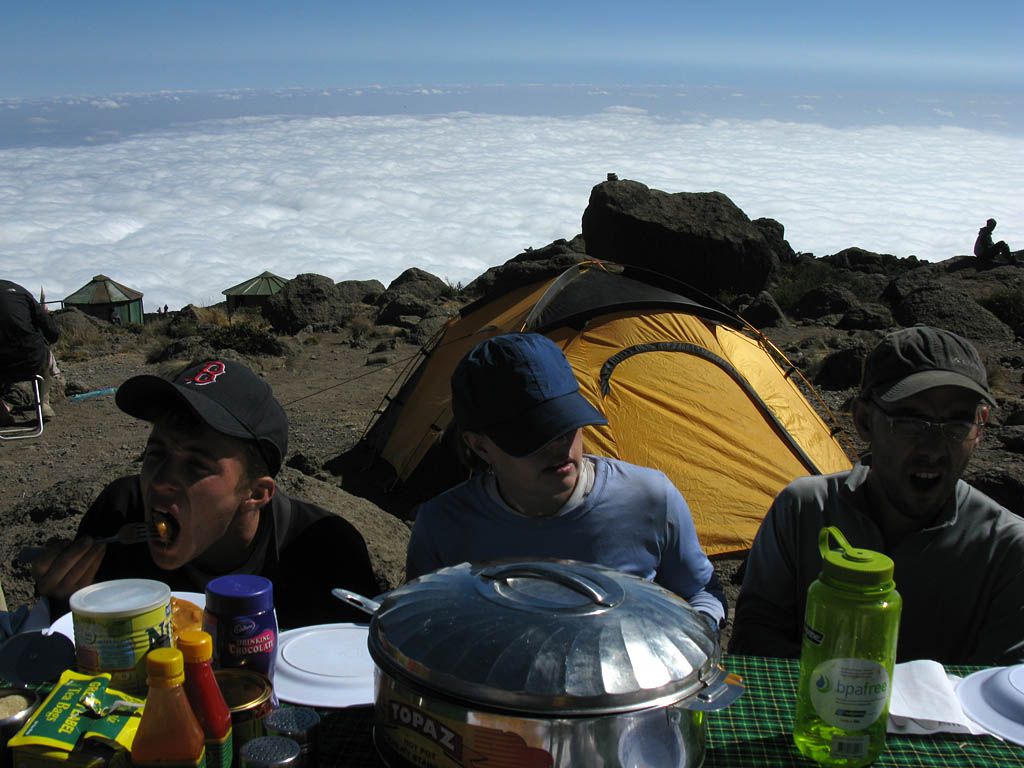 Back on the other side of the valley, the entrance to Karanga Camp was marked by a large boulder which made for quite a landmark. Our arrival was signified by passing the said boulder. The view from Karanga Camp was even better than Barranco Camp, perhaps helped by the camp being on top of a ridge rather than down below in the valley. The cloudscape panorama below was awesome, with thick clouds gathering over the Montane Cloudforest far below. Meru still floating majestically on the haze, and Kibo still dominating in the opposite direction. So now we had several hours of daylight left with which we got to take it easy, which was very much welcomed by me! Although Karanga wasn't much higher than Barranco, it was much more sparsely populated by vegetation, with just some tufty grasses and the odd heather. I guess it's simply more exposed on the ridge top. We had lunch at 3:30pm while the White Necked Ravens played nearby.