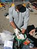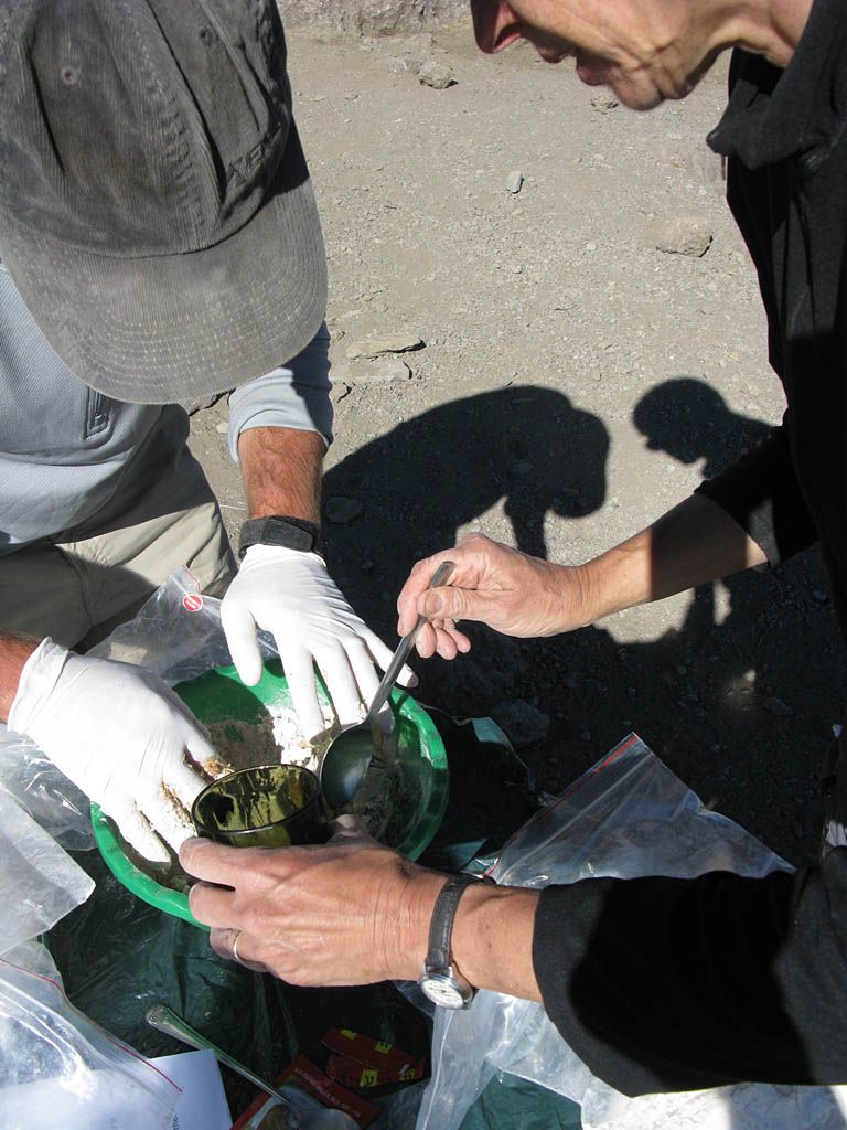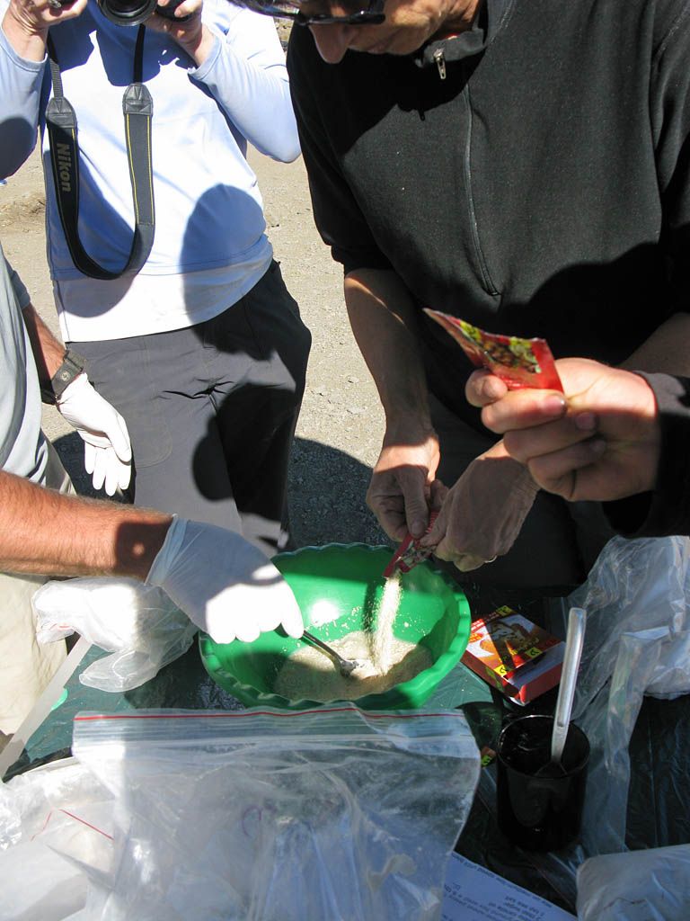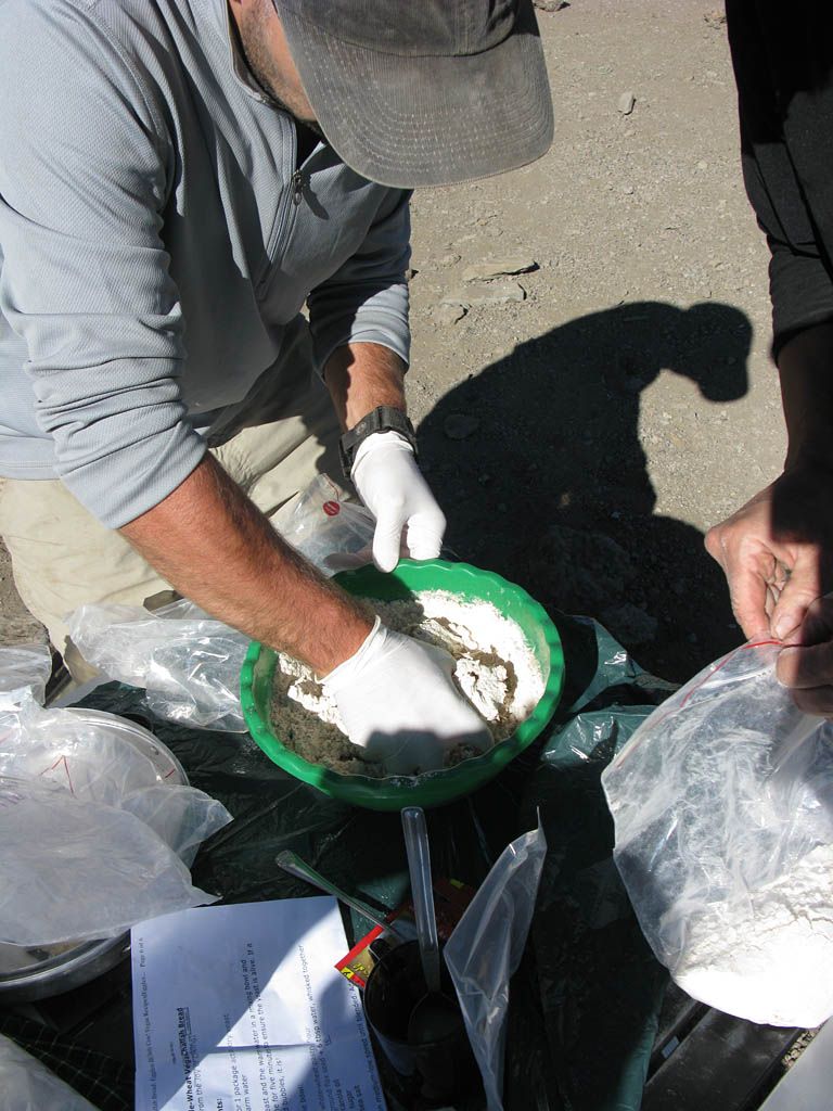 Gathering the ingredients for Challa baking. Process started at Karanga Camp. | Adding yeast and other ingredients to the flour. | Mixing the dough up and adding more ingredients before preparing the dough to rise over night and during tomorrow's hike to Barafu where the preparation will be completed. |