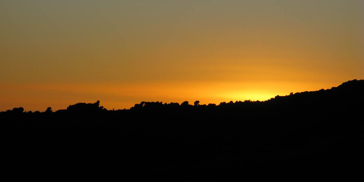 Sunset at Karanga Camp! | White Necked Ravens also admiring the sunset. | The sun sinks below the ridge leaving behind a firey orange sky. | Mount Meru still floating in the deepening twilight. |