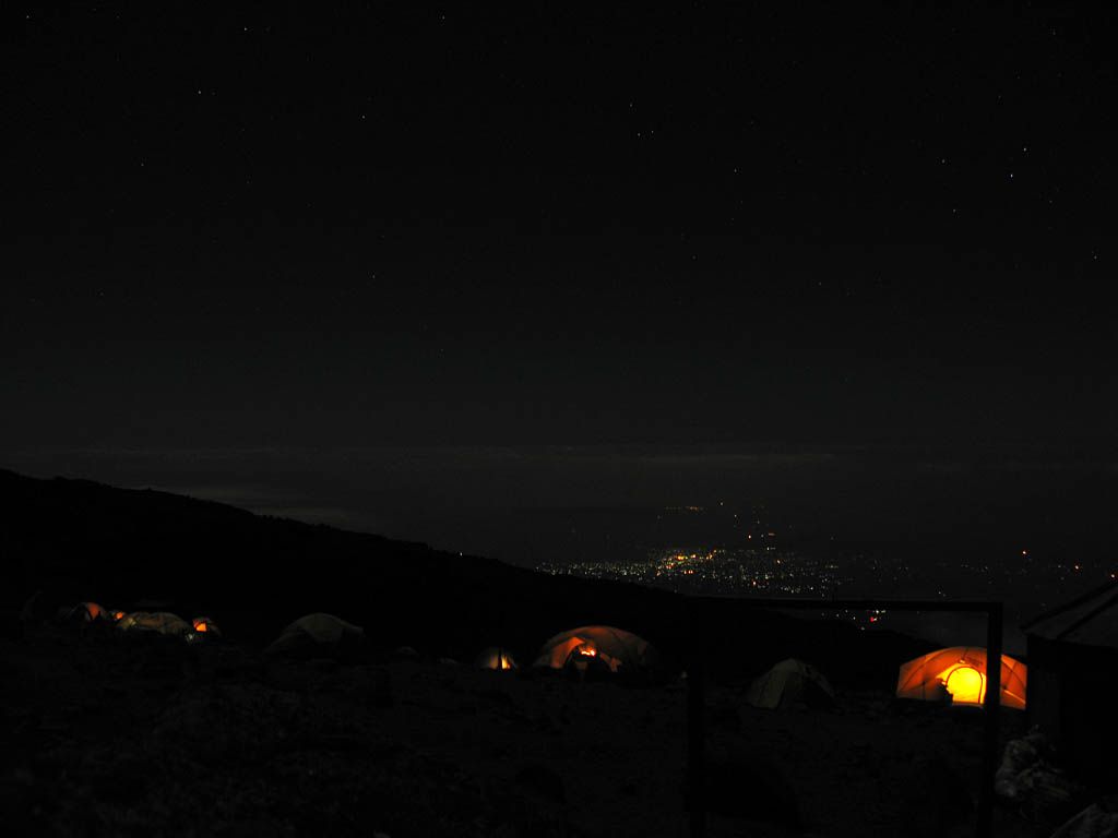 After dark the air was crisp and cold, and the seeing high above the haze was excellent. It was less cold than at Barranco as we were above the valley floor too. I wished I had a telescope on me. Being just south of the equator, Sirius, the brightest star in the sky, was high up. Meanwhile the half moon lit up the glaciers on Kibo itself while below us, the rain clouds had cleared to reveal the lights of Moshi Town blazing more than 10,000 feet beneath us. I took some time to get some long exposure shots by resting the camera on an assortment of boulders before eventually retiring to my tent for the night. I went to sleep soon after 8:30pm, although I was so much more awake than I was 24 hours ago!