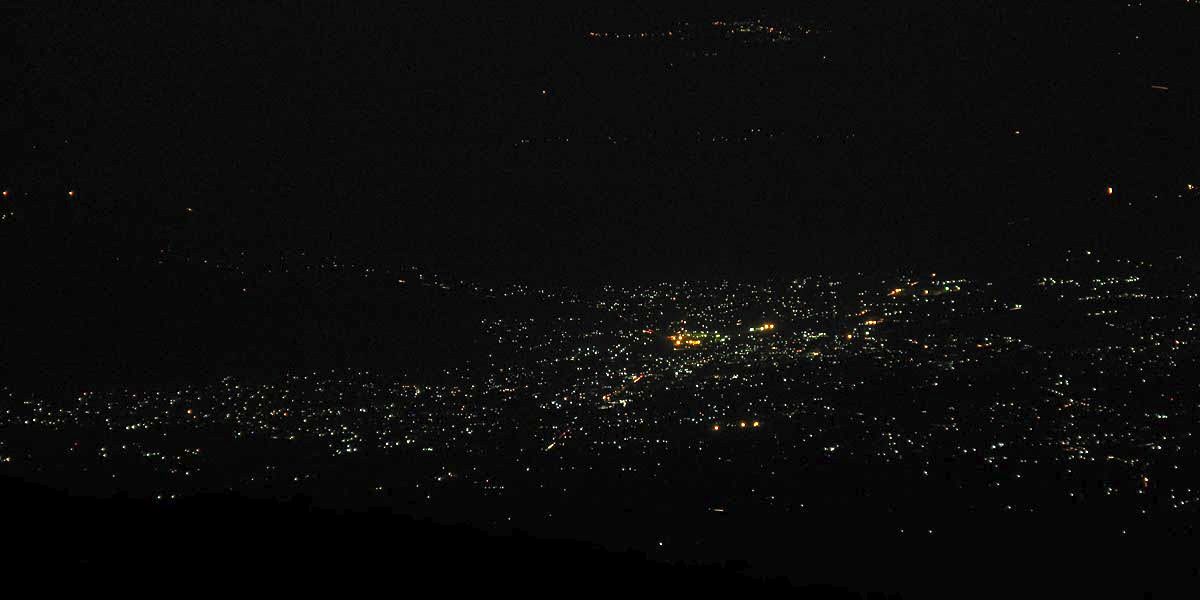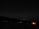 Looking downhill from the camp site. Moshi Town in the background far below. | Looking up at Sirius. | Kibo lit up by moonlight. | Another starscape. | A zoom shot of the Moshi Town lights. |