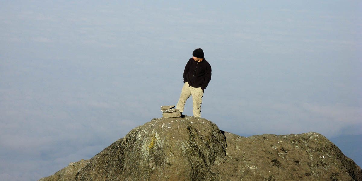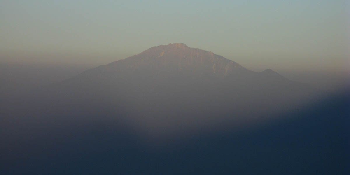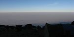 Kilimanjaro shadow receding from Meru towards us as the sun rises. | The sun has already risen down below and shining on the now extensive cloud sheet but we are still in mountain shadow. | Sun about to rise above a lava block. | Misha taking in the view from the top of a large lava boulder. | Early morning at Karanga Camp. The clouds below us are now rather extensive. |