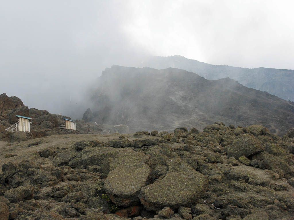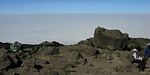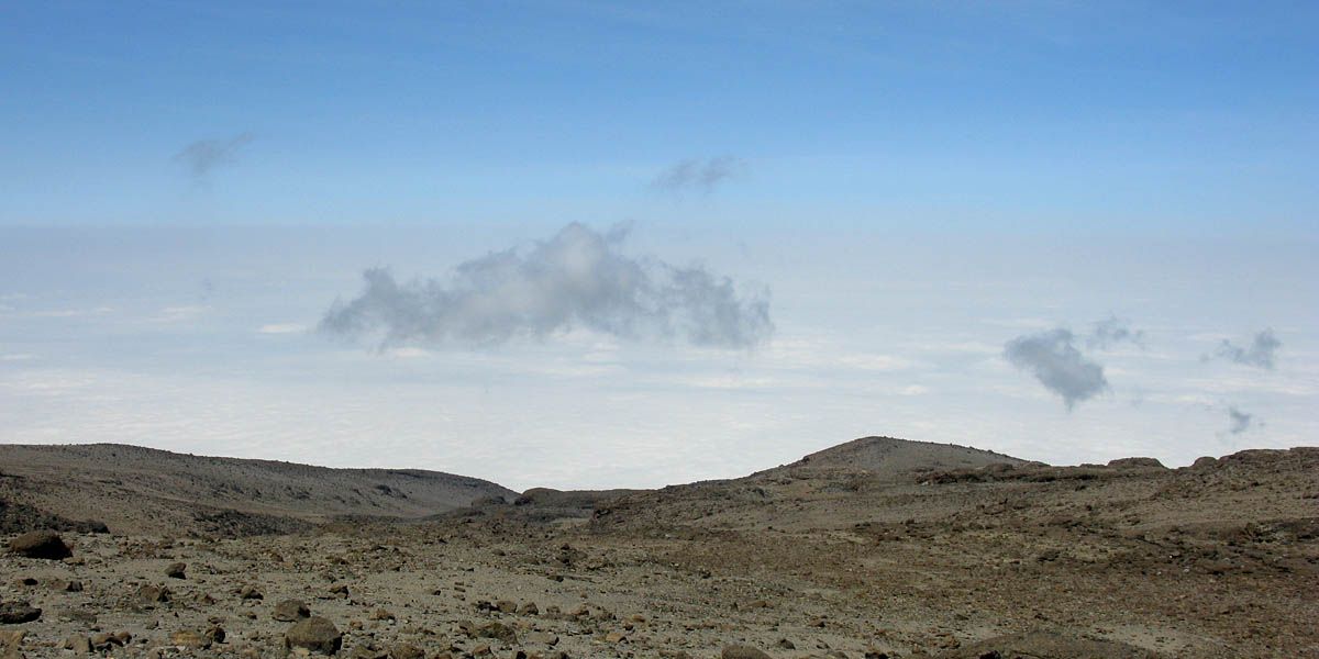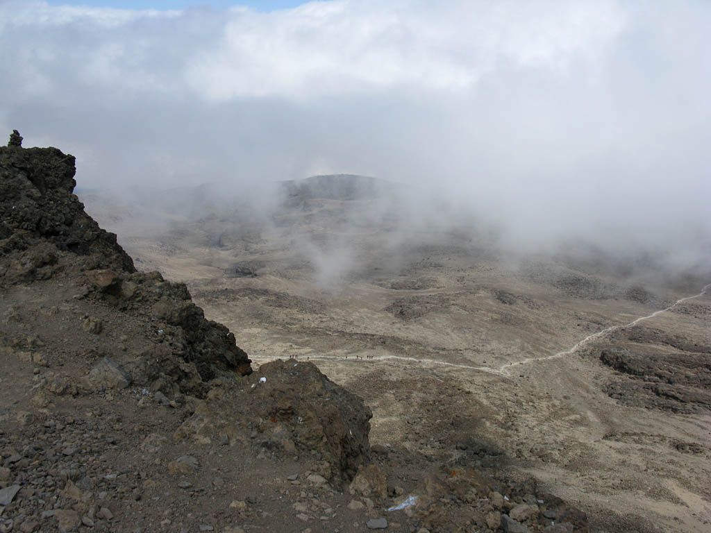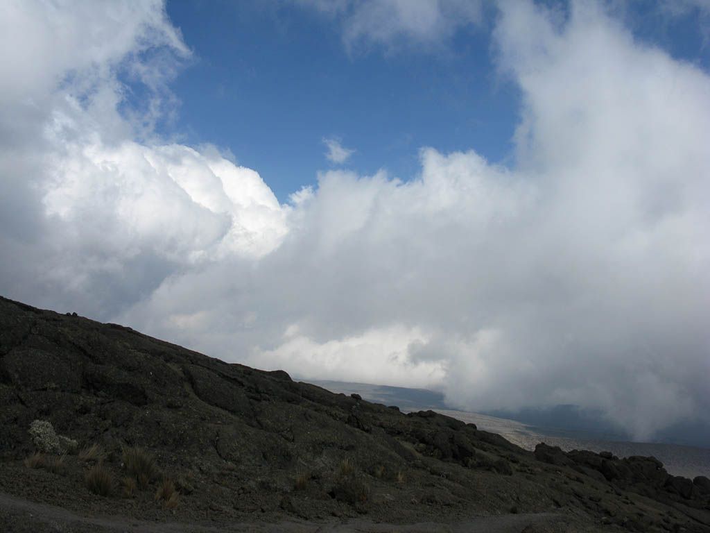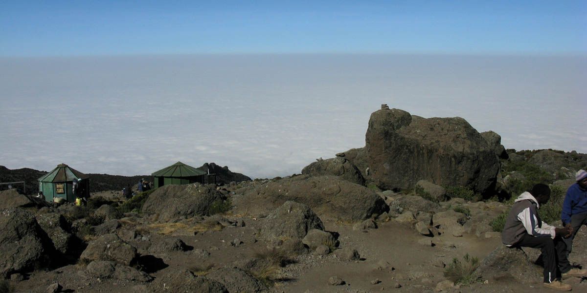 Pausing for breath by some large boulders a little way uphill from Karanga. | Looking back to a now empty Karanga Camp as porters stream past. | Looking down across the clouds towards Meru, ahead uphill, and to the left at Kibo as we continue uphill. |