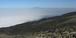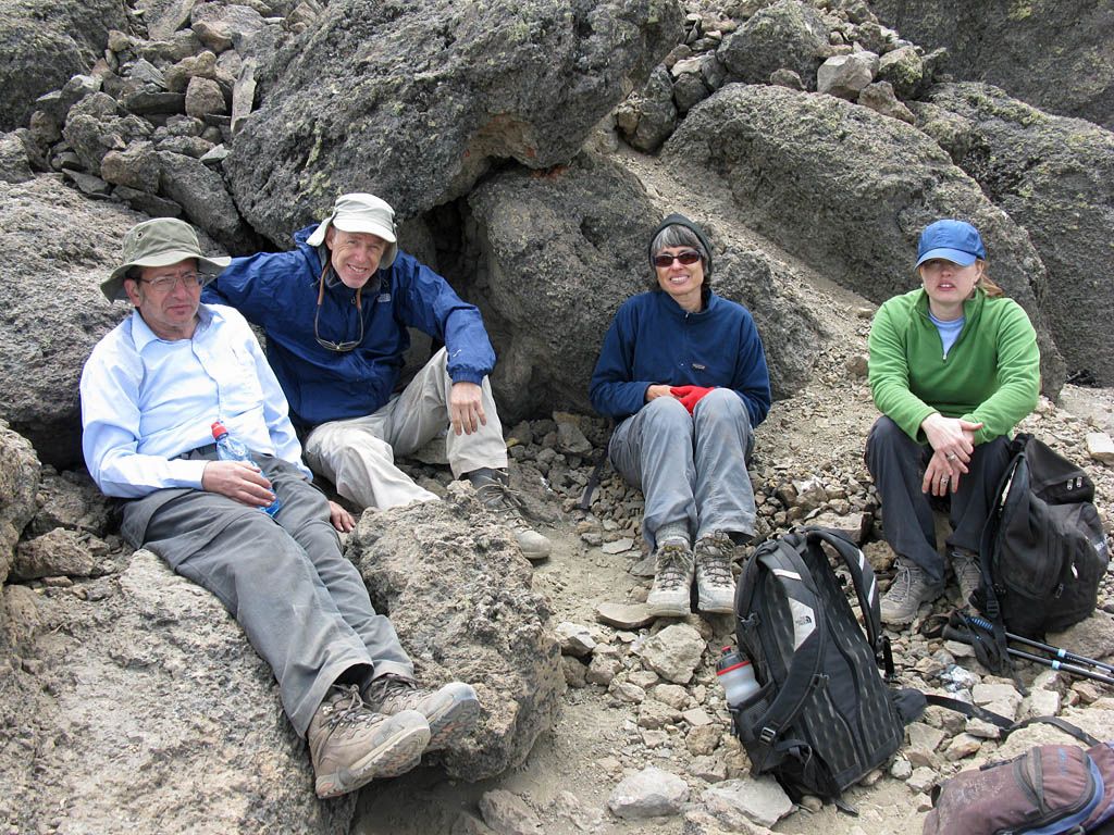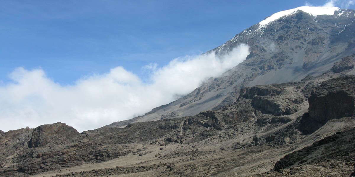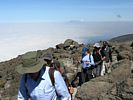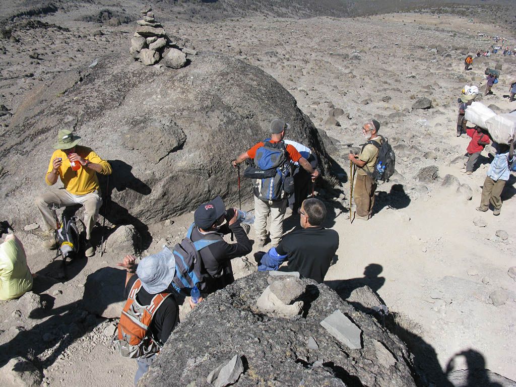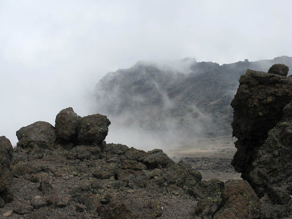 Pausing for breath by some large boulders a little way uphill from Karanga. | Looking back to a now empty Karanga Camp as porters stream past. | Looking down across the clouds towards Meru, ahead uphill, and to the left at Kibo as we continue uphill. |