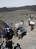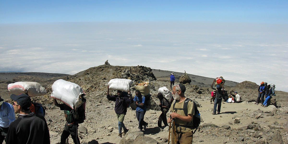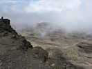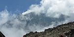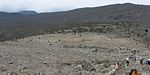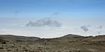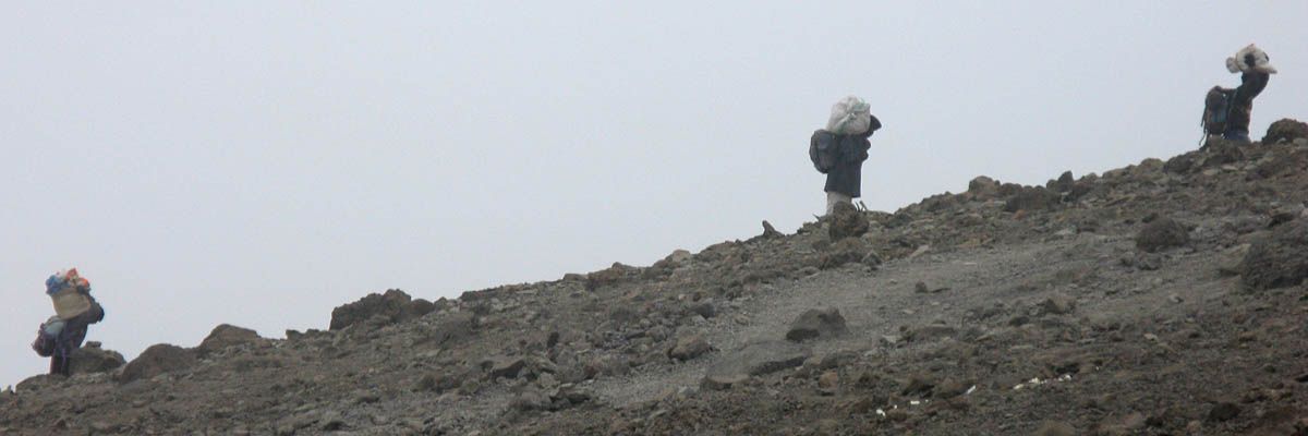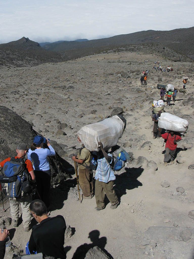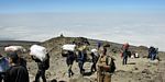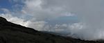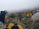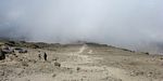 Spectacular approx 180 degree panorama looking East from the top end of Barafu Camp Site. Somewhere in the centre in cloud is Kibo's sister peak, Mawenzi. | Taking another look at the path to the summit as cloud blows through rapidly over the ridge. | More porters arriving and walking up through Barafu Camp. | We spend increasing amounts of time in cloud until later on it starts to disperse as Shabbat comes in. |