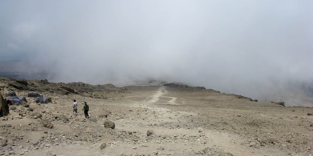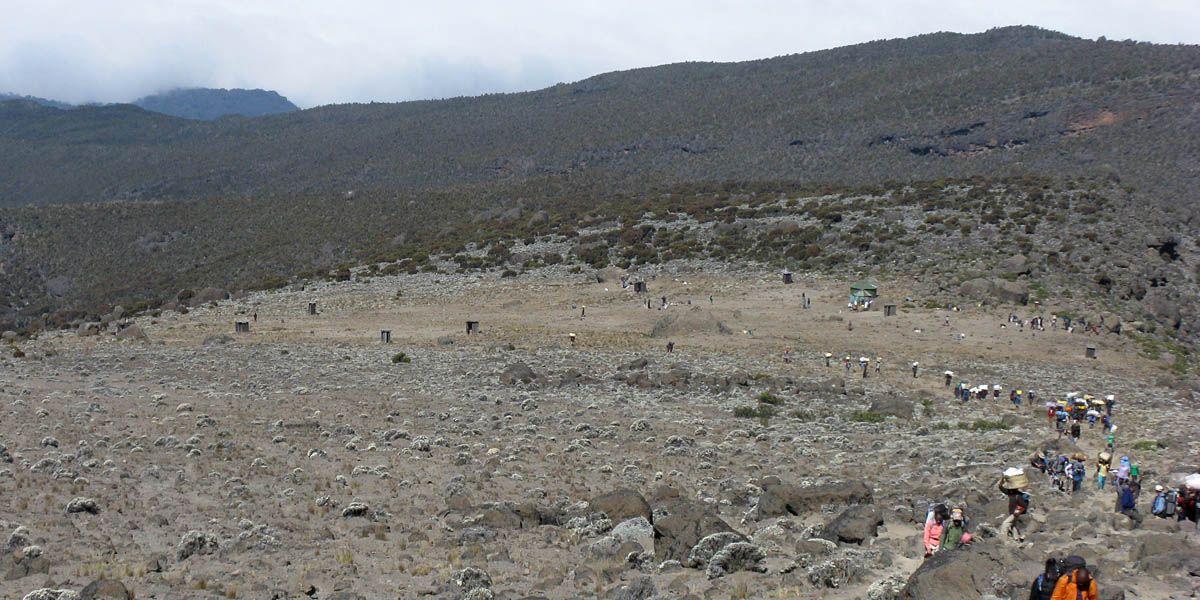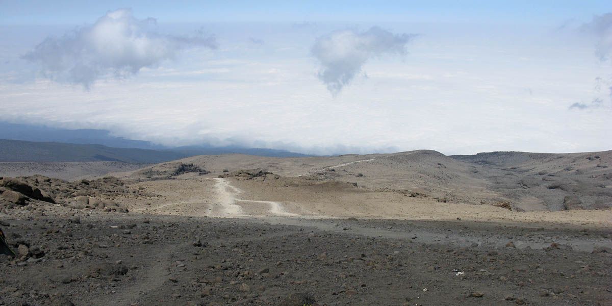 Almost at the bottom end of Barafu now. | Looking down across the Mweka trail ridge. | Arriving at Barafu. | The top end of the Mweka trail. | Looking back the way we came as clouds roll in. | Arriving at Barafu hut. |