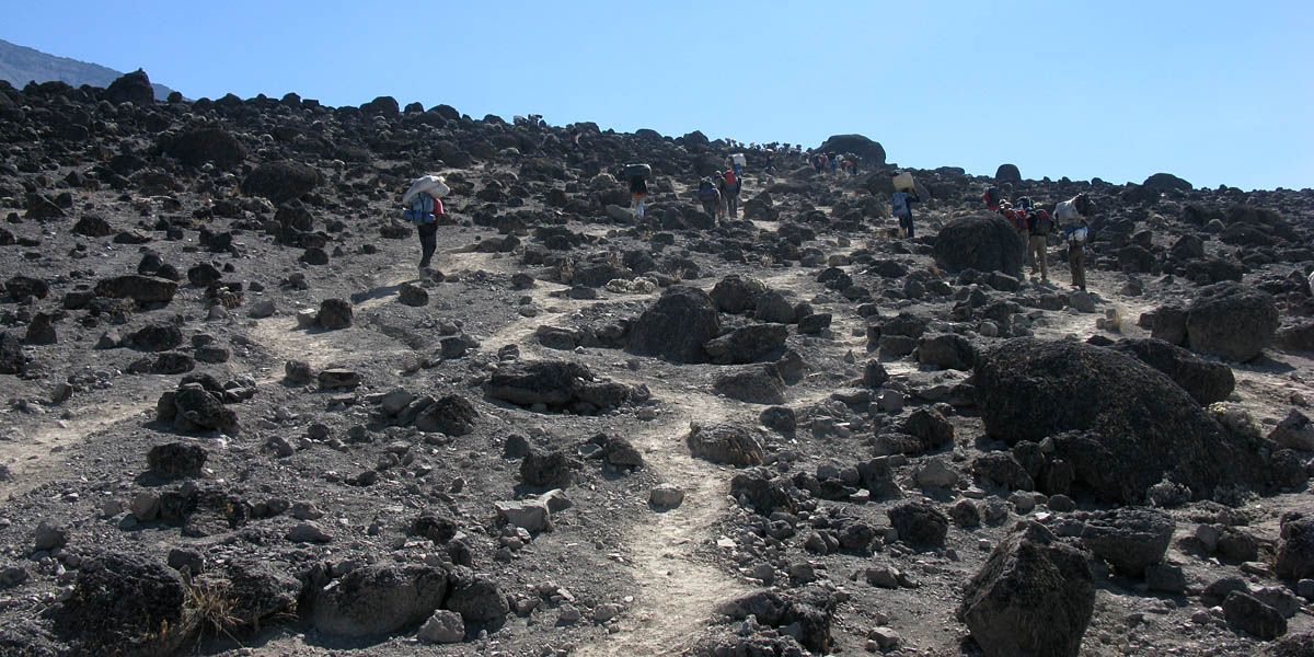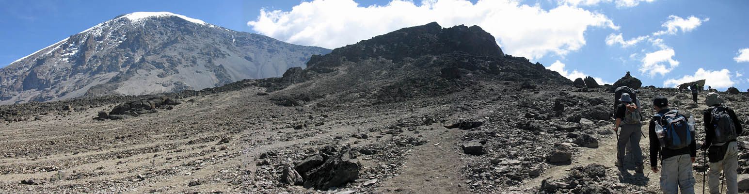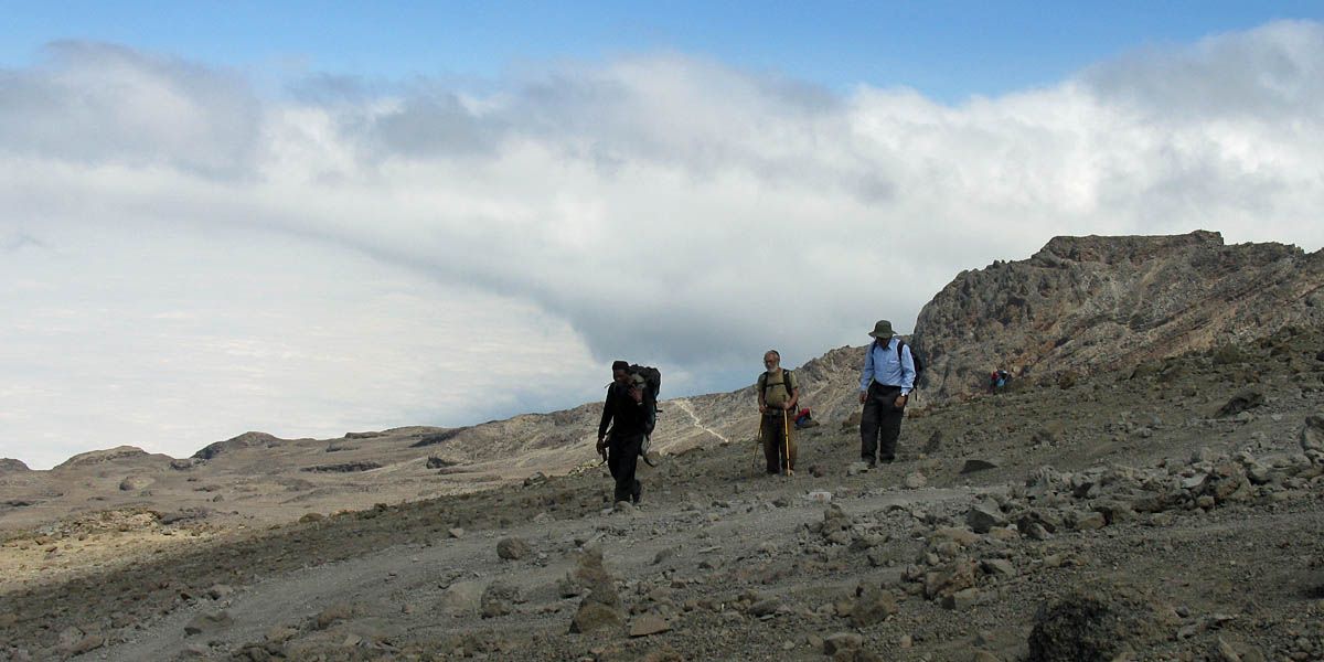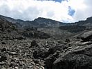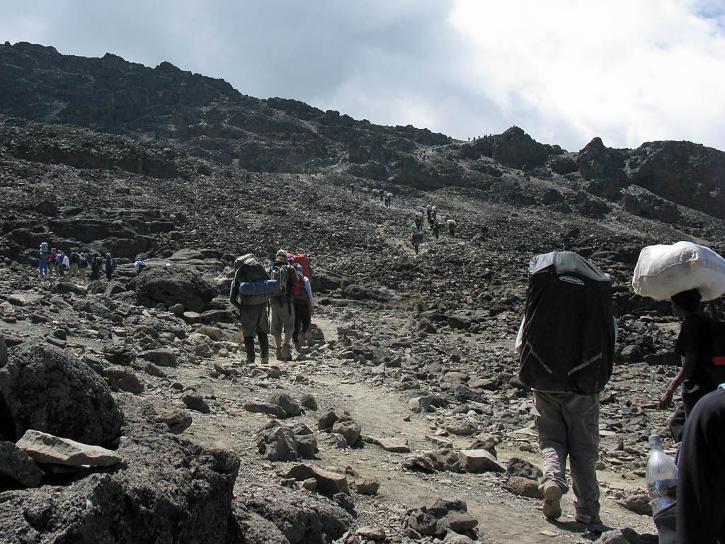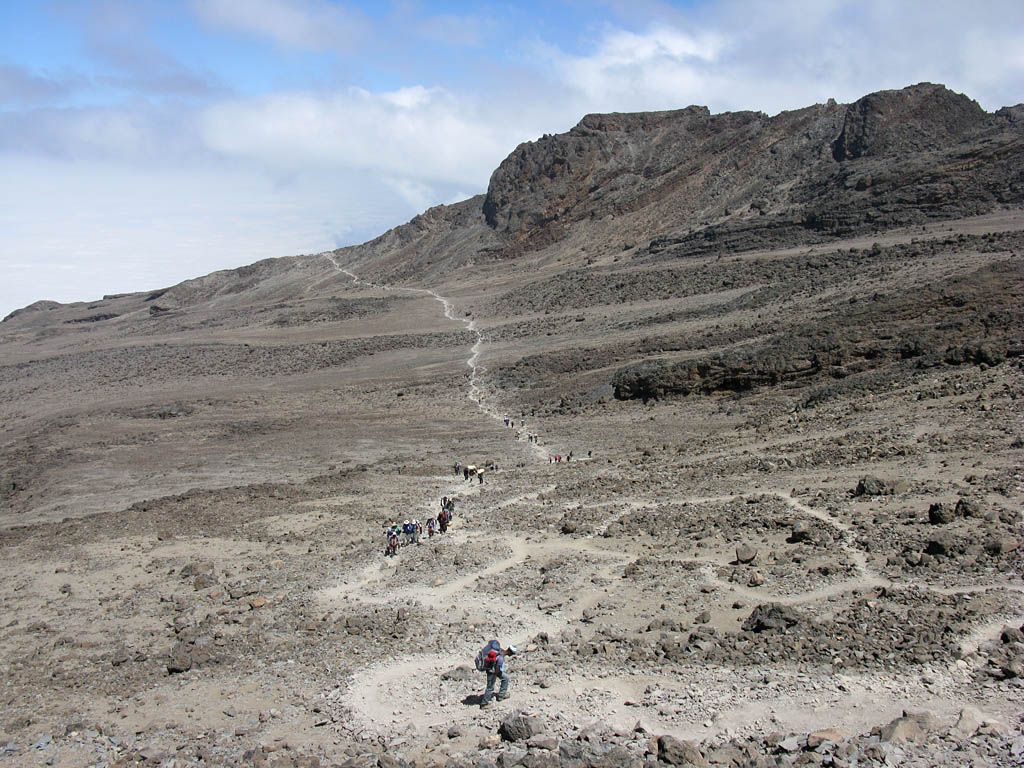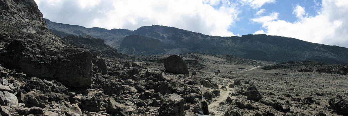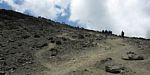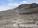 Slowly ascending the side of the Barafu ridge. | Looking back across the basin along the path we have just walked. | Looking uphill along the side of the Barafu ridge towards Kibo as clouds roll in. |