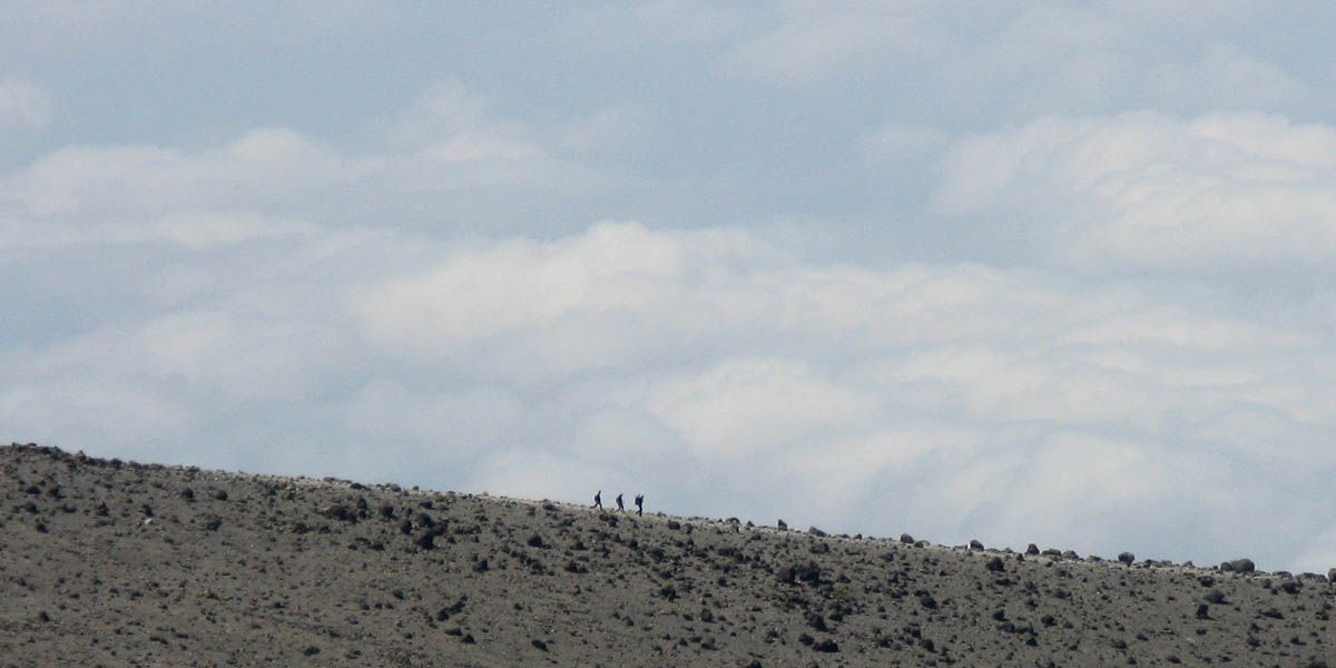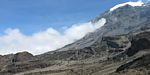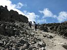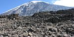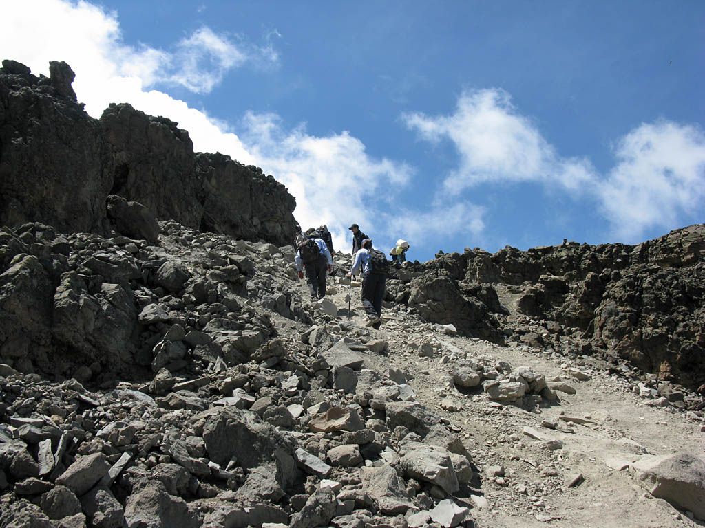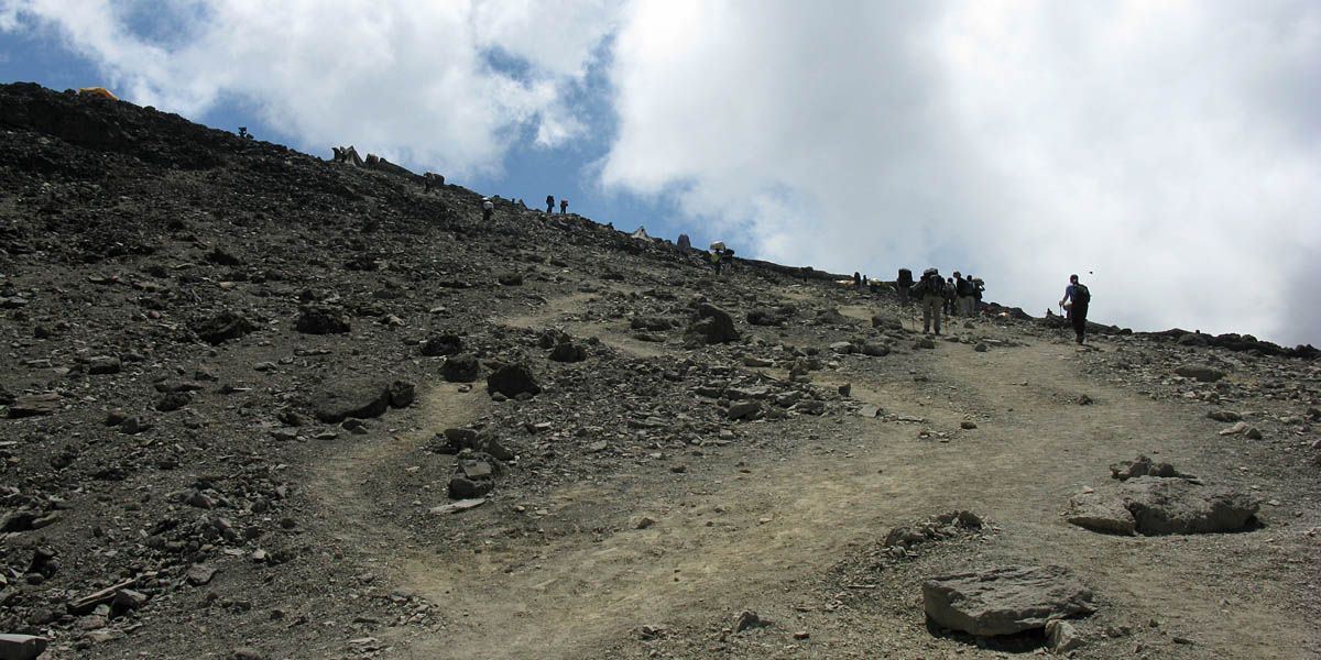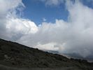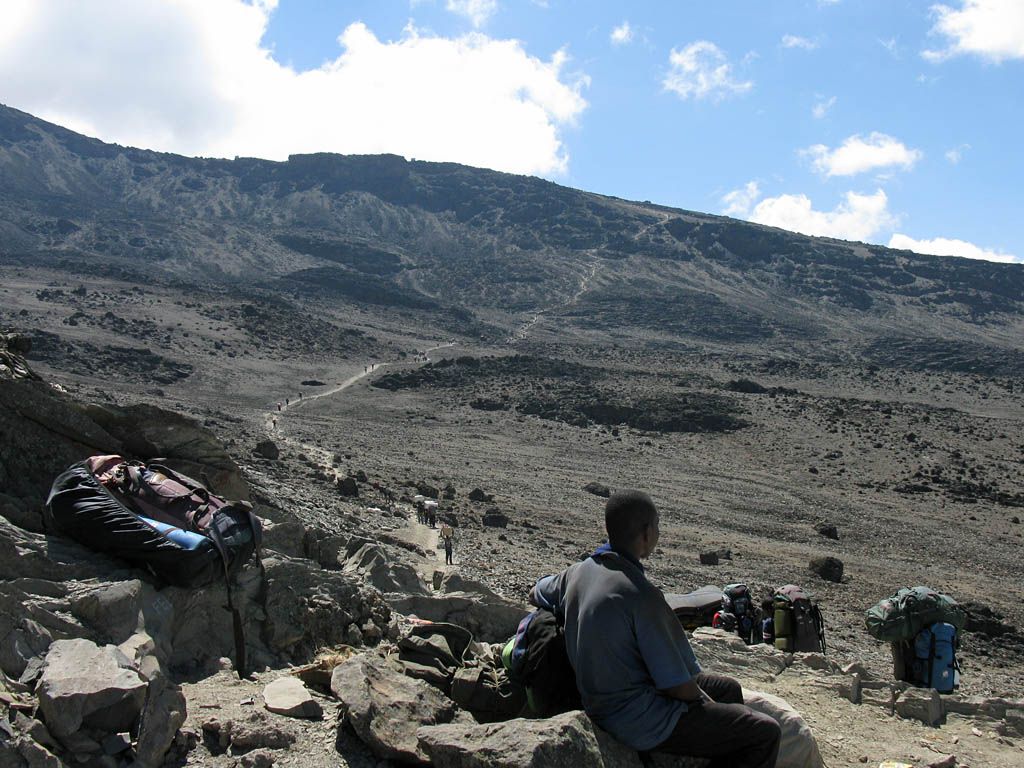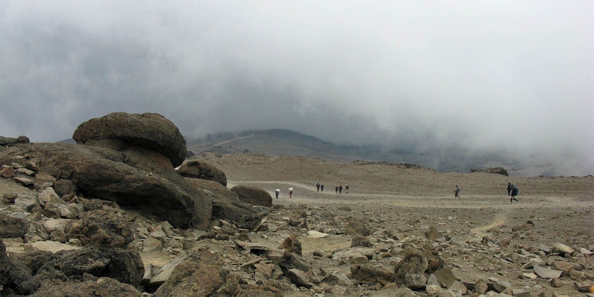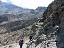 Slowly ascending the side of the Barafu ridge. | Looking back across the basin along the path we have just walked. | Looking uphill along the side of the Barafu ridge towards Kibo as clouds roll in. |