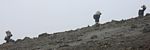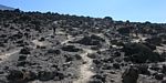 Admiring the view as we pause at the crest of the last hill before crossing a spectacular basin to Barafu. | Up ahead people can be seen descending along the Mweka trail from Barafu. This will be our way down after summit day. | Ahead is one small descent, then we cross a spectacular primordial basin before one last steep ascent to Barafu Camp. The air is pretty thin now. | Descending into that last basin before Barafu. | A closeup shot of *TODO* Identify |