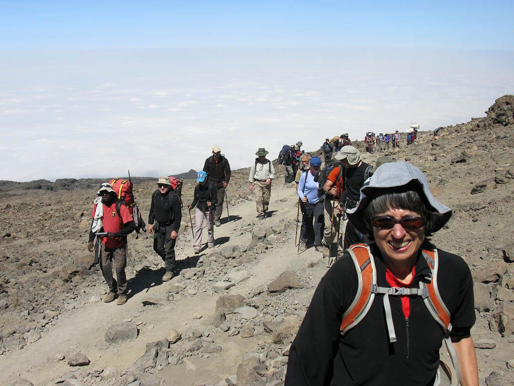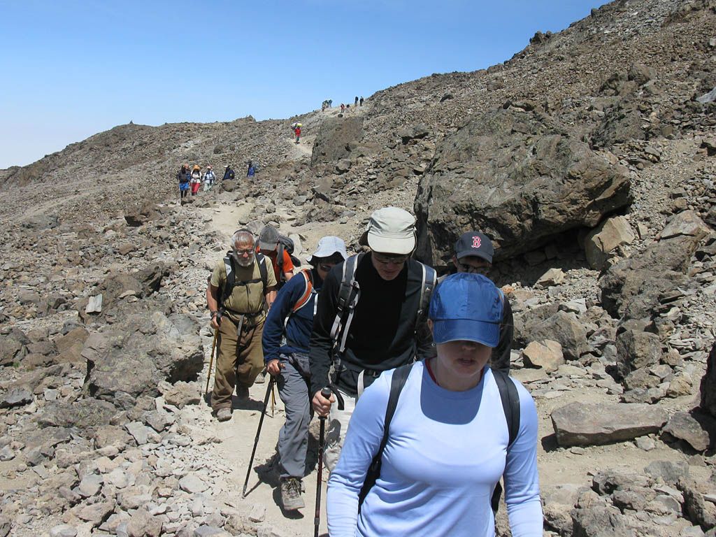 I woke up at about 6:20AM. When I looked outside at 6:30AM I could see the shadow of Kilimanjaro fallen half way across Mount Meru. Over the next hour, as the sun rose behind the ridge which we shall later walk up along, I watched the shadow recede steadily back towards me. Around 7:30AM the sun popped up over the ridge from behind a lava boulder. The plains below, bathed in sunshine much earlier than us in the ridge shadow, were covered by extensive cloud this morning. But up at Karanga Camp, it was chilly but glorious in the unbroken tropical sunshine. I got ready and soaked up those warming rays until breakfast time at 8:30AM. The plan was to set off for Barafu Camp at 9AM. I also switched to my backup Morrison's hiking sticks as my main Knight hiking sticks had malfunctioned. (On one stick a joint would not tighten, and on the other stick a joint would not undo. Doh!)