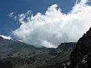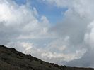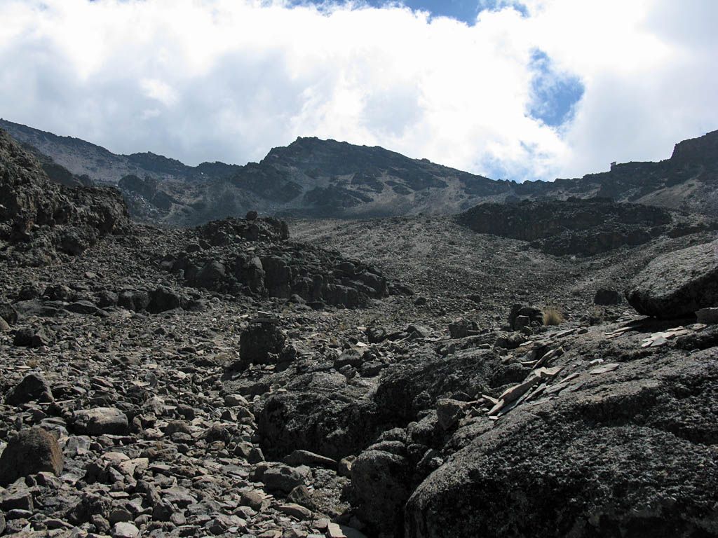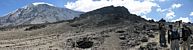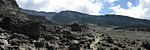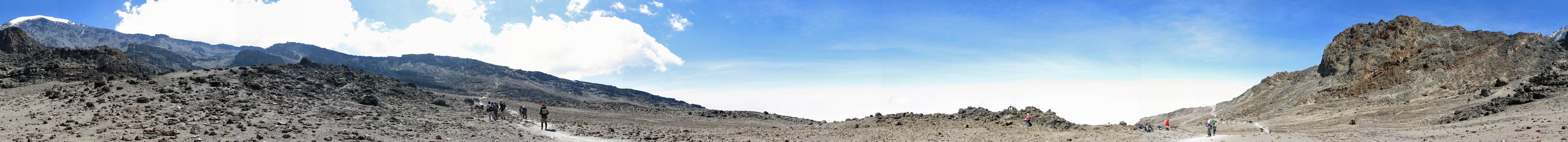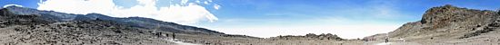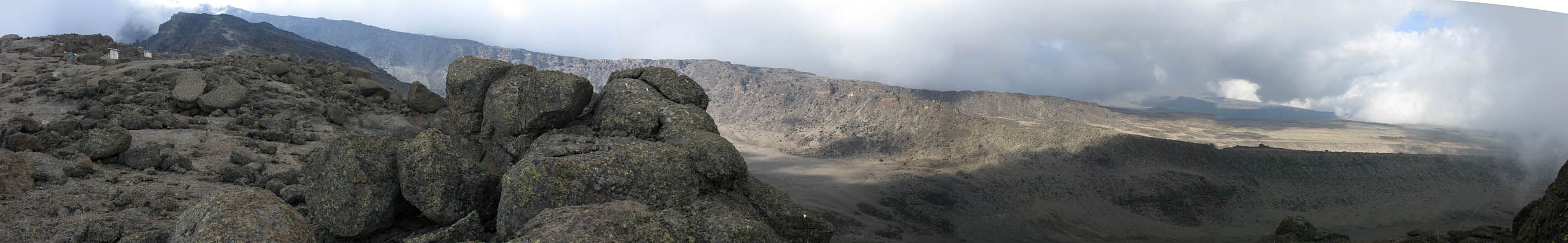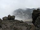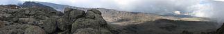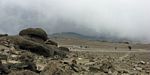 A 360 degree panorama takin in the middle of the basin before Barafu (which is just left of centre at the top of the ridge). | Looking downhill as clouds start to bubble up on the high ground. | Looking uphill the landscape is rocky and spectacular. |