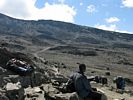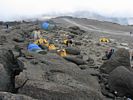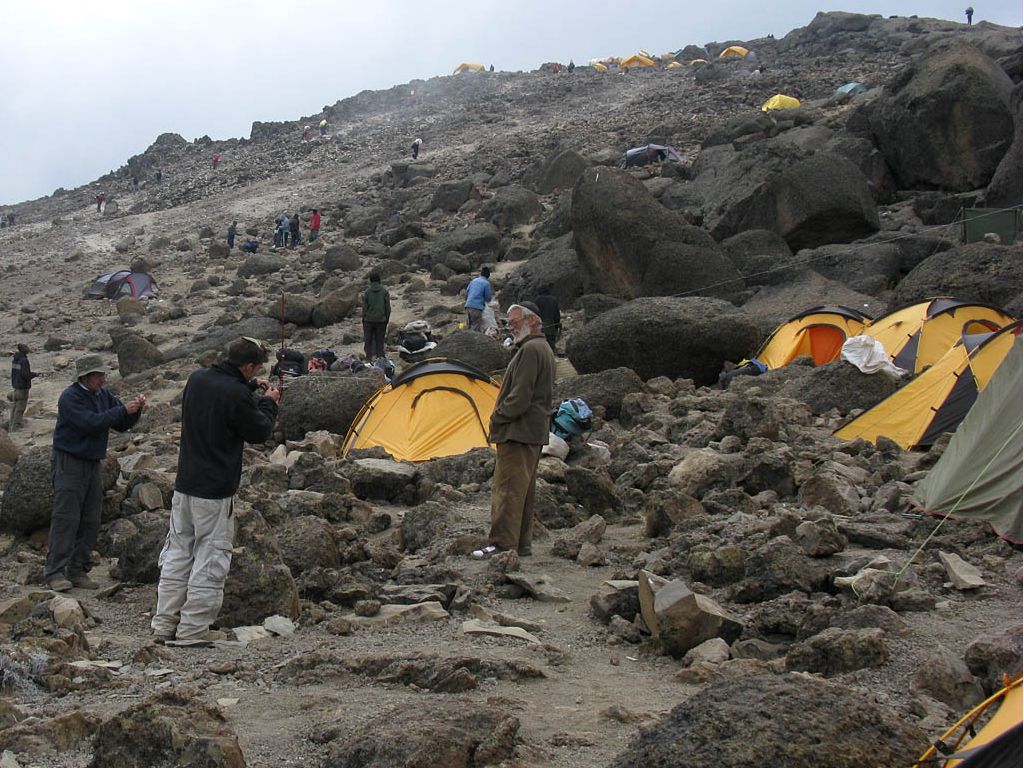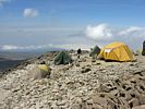 Having arrived at the bottom end of Barafu we climbed further (slowly and slightly out of breath in the rather thin air!) all the way to the top end where the huts are. It was hard to do this without getting a minor altitude headache as we were now at 15,000 feet and not yet acclimitised to this altitude. But a pause and a few deep breaths soon cleared it rapidly. On the way up I noted how spectacular Barafu looks, with tents strewn across the sides of the exposed rocky ridge with the huts up top. Up top the path that leads up past Kosovo Camp and up the side of Kibo to the top was visible winding its way up the side of the ridge on which Barafu sits.