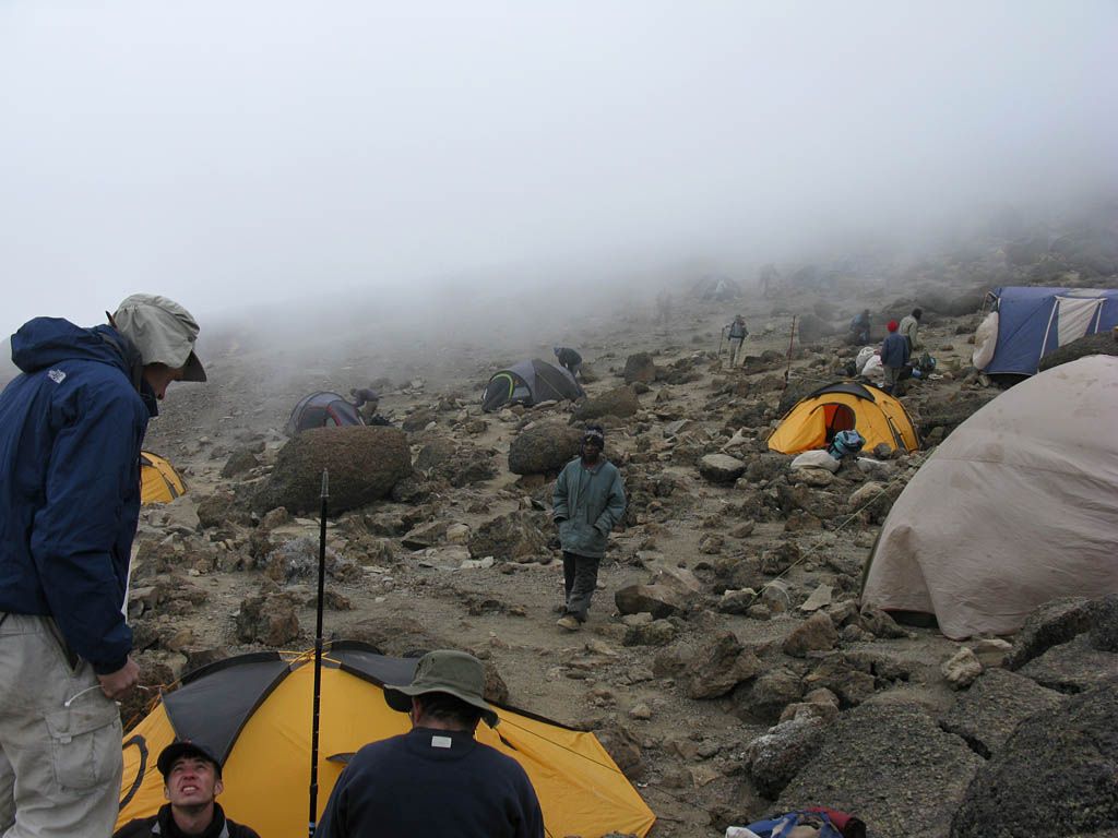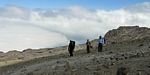 All around us clouds are now forming and rolling through. | Cloud obscuring the Mweka trail. | Bob, Yedidya, Susan and Anne waiting for the tents to be erected. | Passing cloud making a beautiful frame for Kibo. | The tents are being erected steadily by the porters. | Looking up at Kibo again from the tent site. |
