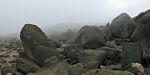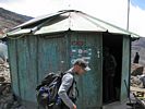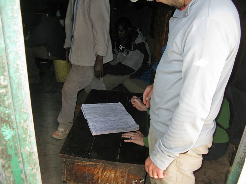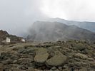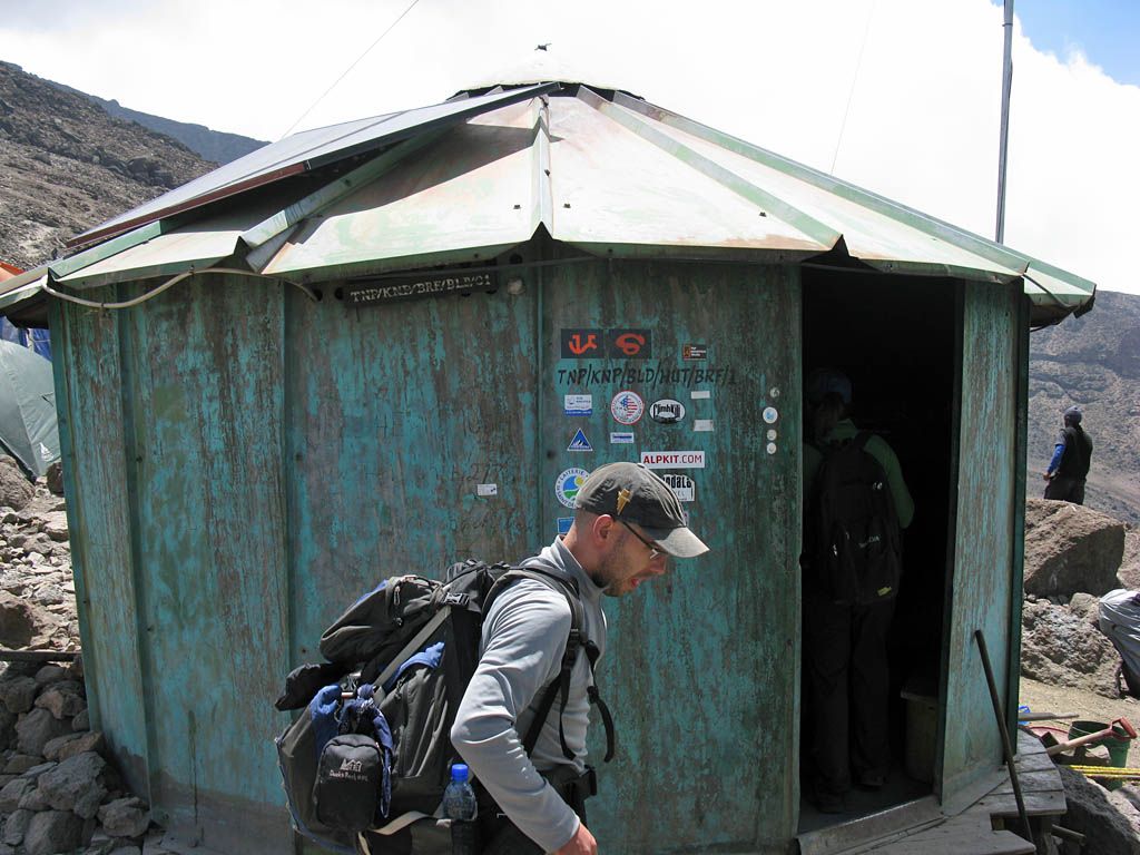 Barafu hut at 15,000 feet! | Looking at Kibo from Barafu hut. | Signing in at Barafu. | Sneaking a peek at the path to the summit. This initial climb will take us to Kosovo Camp, and then from there up the side of Kibo itself. | Looking back downhill from the top end of Barafu. | The path that we earlier walked from Karanga on. |