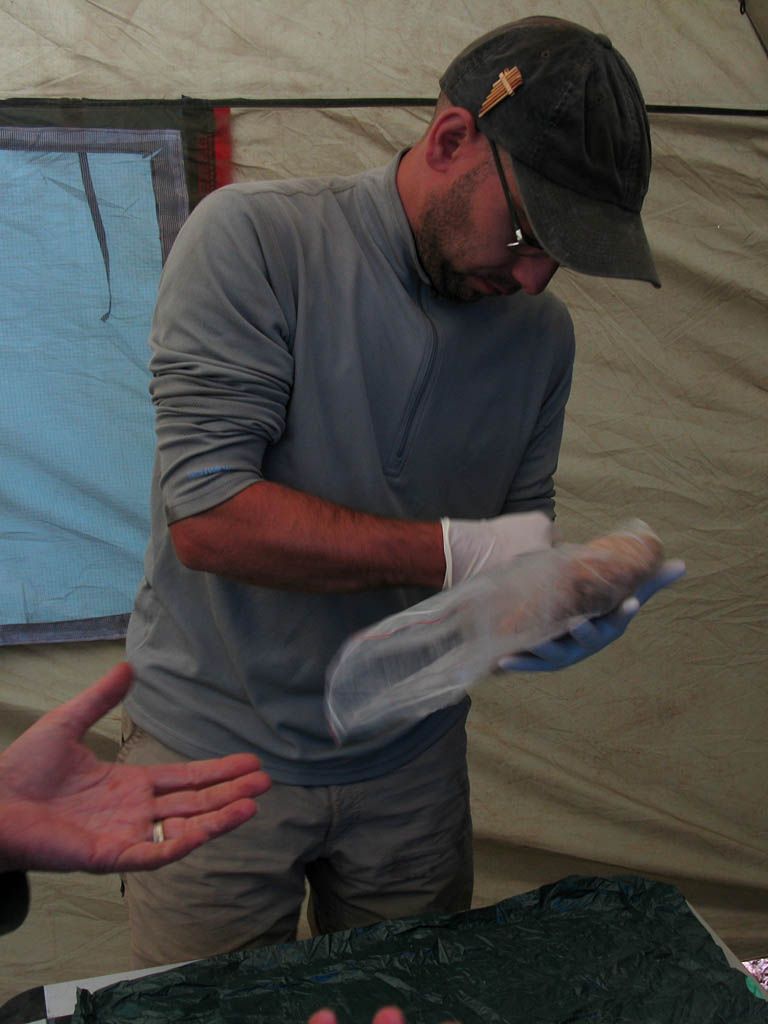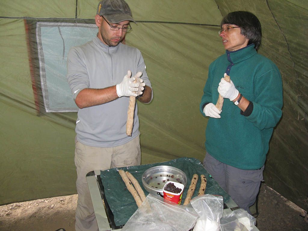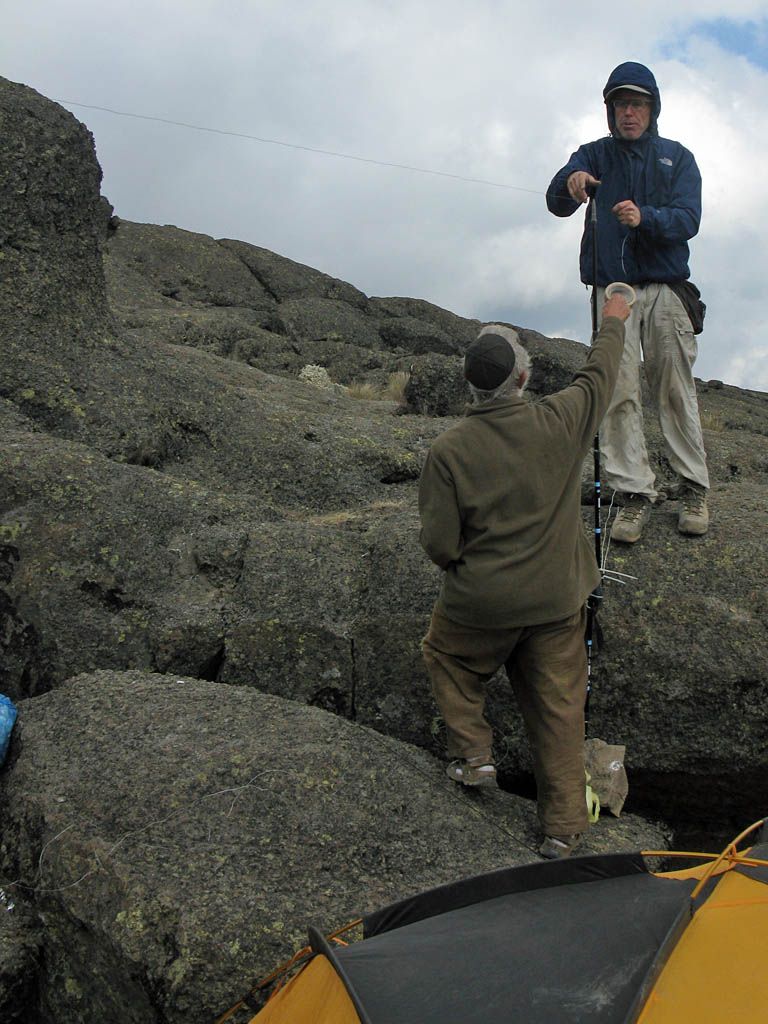 Once the tents were set up, and as the clouds built up more and increasingly obscured the view and enveloped us in hill fog, we went about setting up a Shabbat Eruv around the tents. The wall of the petrified lava flow served as one side of the eruv. To surround the tents, we set up 3 high poles made up from hiking sticks. Two were at the top and bottom ends of the camp by the lava wall, and the third pole was out fairly close to my tent. They held the wire about 8 feet high so that they cleared our heads. Then a metal wire was strung between them to comnplete a triangular enclosure that encircled all the 'Jewish' tents, as well as the kitchen, dining and sit down loo tents. Just the porters' and William's tents lay outside. We had a break mid eruv building for a small lunch. Of course it didn't go fully without a hitch. The inevitable tangle occurred early on and took ages to undo. Once completed, tape was used to make the wire more visible. We also piled some rocks to make some 'steps' to make it easier to reach the loo tent across some large boulders, and just as Shabbat was about to come in, we set off some glow sticks and secured them in strategic locations to give us about 8 hours of dim lights to help us find our way around the camp in the dark without the use of headlights (which are not allowed on Shabbat).