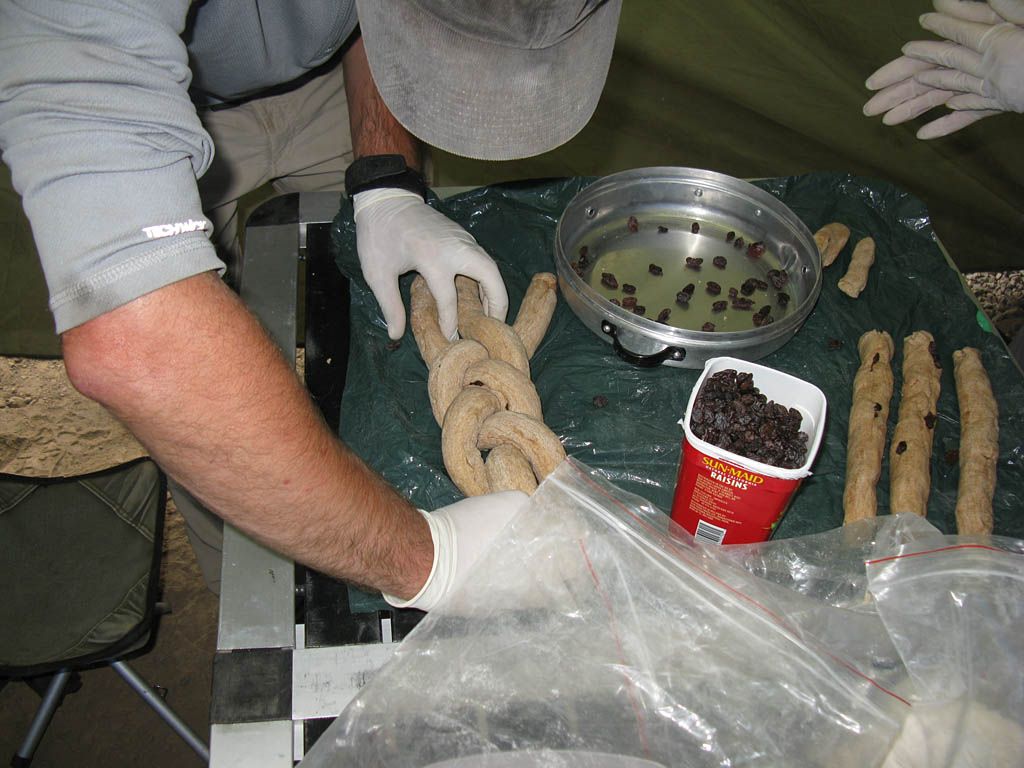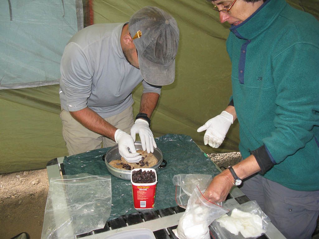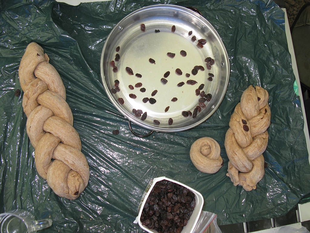 As the eruv was being completed outside, Susan and Misha resumed the Challa preparation in the dining tent. Misha punched down the dough after it had risen over the last 24 hours. Then raisins were mixed into the dough which was then rolled into sausage shapes ready to be pleated. Once the pleating was completed we had two nice looking wholemeal raisin Challas plus a small Challa roll for Seudah Shelishit (the early evening meal before Shabbat ends). In all there were three Challas plus the small Challa roll which were baked in the wonder pot over the stove in the kitchen tent in two goes. They smelt delicious when they emerged freshly baked!
