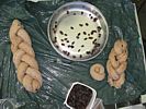 Punching down the dough after it had had time to rise on its way up from Karanga. | Mixing raisins into the dough. | Rolling the dough into sausage shapes ready for pleating. | Pleating the dough. | Two Challahs and a mini Seudah Challah ready for baking. |