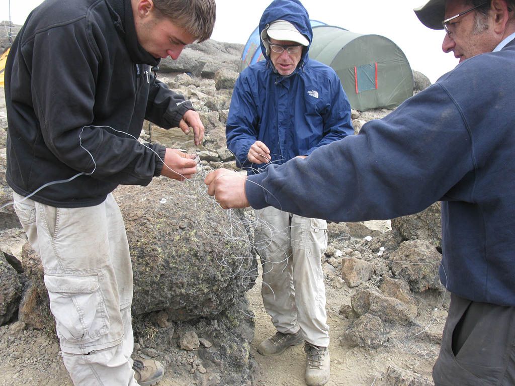 At 7:30AM I woke up with a headache. Apparently this is common at this altitude. During the day I am able to control my breathing to keep the altitude headaches at bay. But in the night my breathing is shallower and automatic. Already by this time the sit down loo tent had been resurrected. After a good drink and basking for a while in the glorious early morning sunshine the headache soon cleared. Phew! I also noticed that a bowl of water that had been left out overnight had frozen solid. So it was rather colder than it felt when I was out there in the night. Yedidya and Boaz proceeded to daven Shacharit. Meanwhile the porters repaired a broken pole so that they could then resurrect the dining tent. It was another beautifully clear calm morning on the mountain, with a thick layer of stratus far below forming a band that enveloped the montane cloud forest. Clearly a local effect of the mountain on the weather, as further afield on the plains it was much clearer.