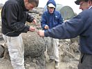 Using hiking sticks to build posts to hold the eruv wire. | Laying out the eruv wire and attaching it to the poles. | A key part of the process was dealing with a large tangle that formed while laying out the wire. | My hiking sticks set up as an eruv post. | Yedidya up on the petrified lava flow setting up the eruv wire there. |