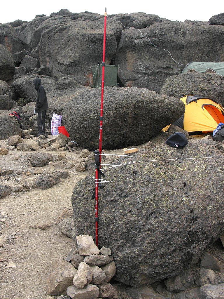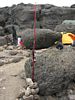 Looking down over the camp site with completed Shabbat Eruv from the post up on the rocks. This, along with my red sticks and another post beyond the dining tent completes the eruv. The lava wall forms a natural final link. | Another view of my hiking sticks holding up the eruv. We are now ready for Shabbat at 15,000 feet! |