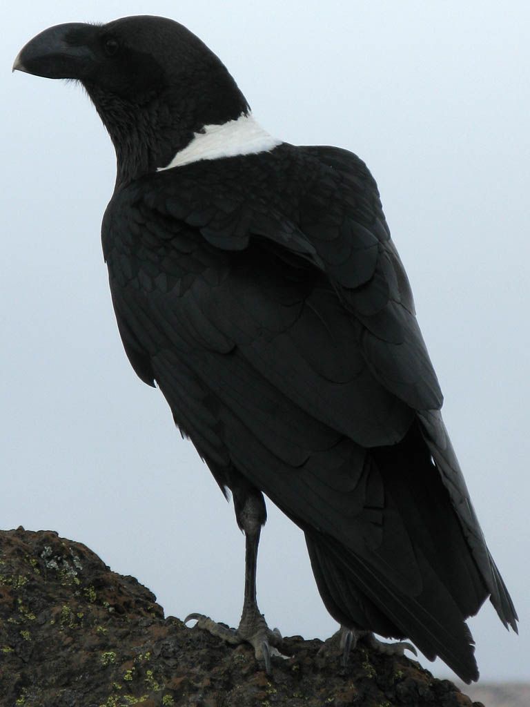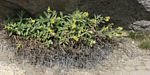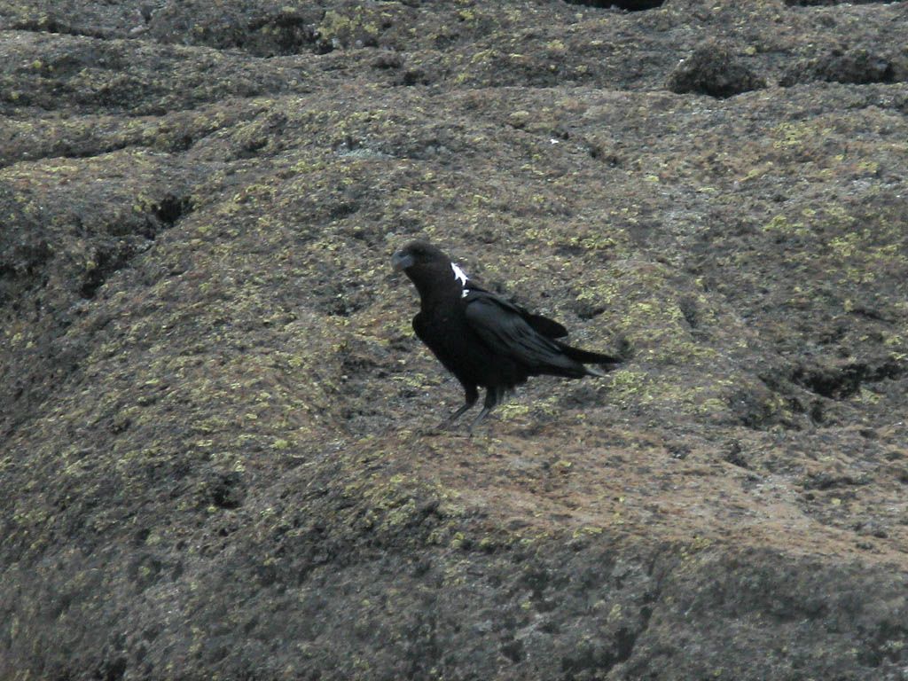 Some of the plant life hanging on in the shelter of hollows in and around the petrified lava flow. Including Helichrysum cymosum's tight clusters of small yellow flowers. *TODO*: Identify others? | Another White Necked Raven watching on. |