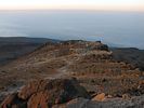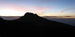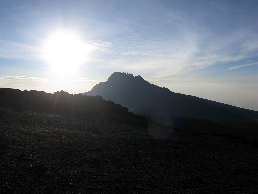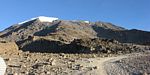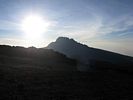 Dawn behind Mawenzi as we climb the path rising up from Bafaru Camp. | Looking down at Barafu Camp from half way up to Kosovo Camp. | At the top of the slope and walking along towards Kosovo Camp and Kibo itself. | Mawenzi silhouetted by the early morning sun. | A zoom shot of Stella Point from the Kosovo Camp area. | In front of us the path climbs increasingly steeply up the side of Kibo. |