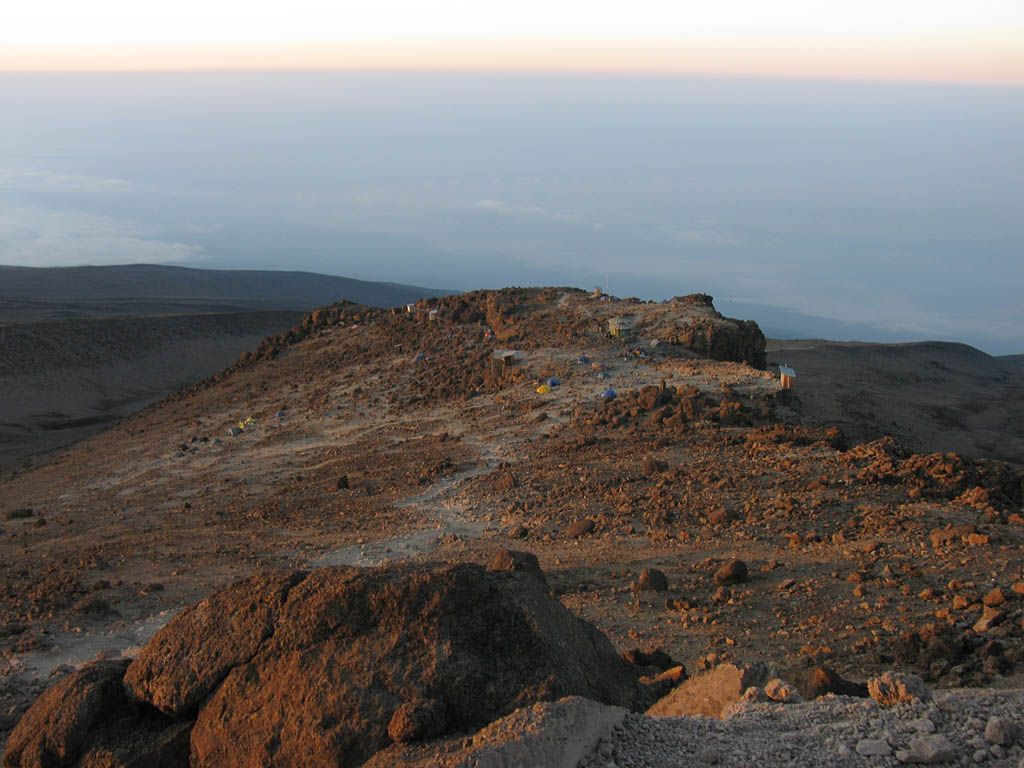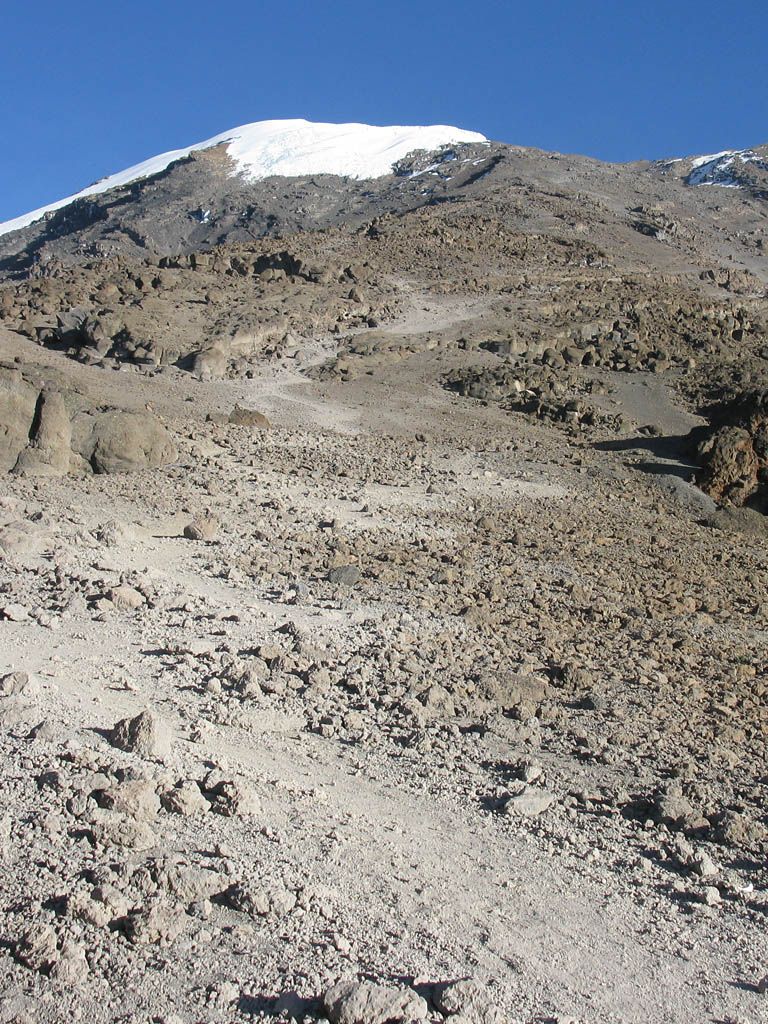 I woke up at 4AM after a very noisy and windy night. The first thing I noticed when I got out of the tent was a brilliantly shining upside down Orion low but prominent in the northern sky. Meanwhile there were already head torches flickering away high up on Kibo just under Stella Point. Breakfast was served to my tent in the dark as the dining and loo tents were still down after they didn't stand a chance in those vicious gusts of wind. Then a wait while the religious guys davened Shacharit. Eventually we set off at 6AM, just before dawn.