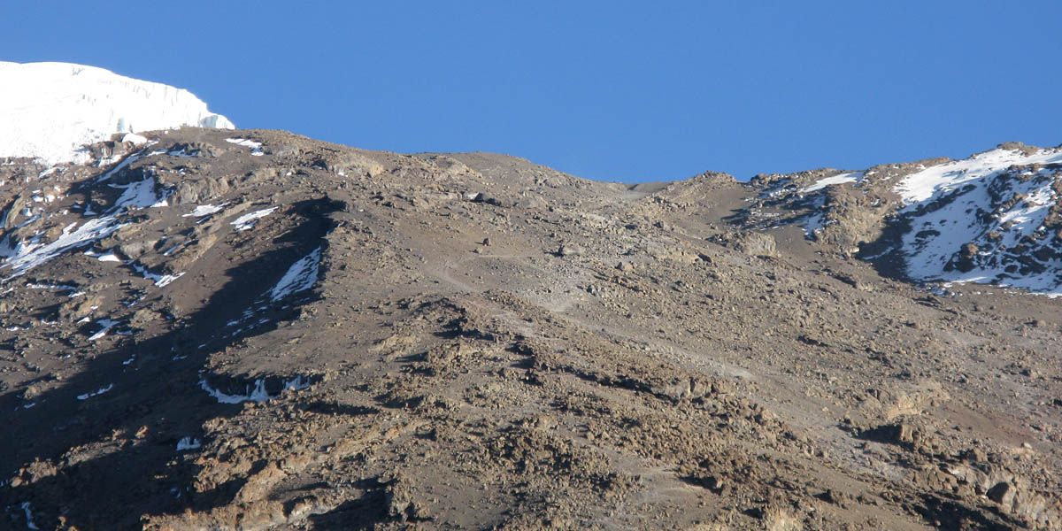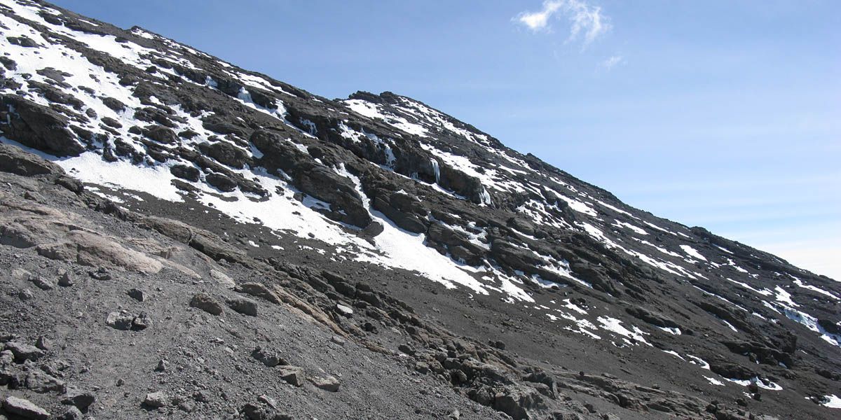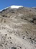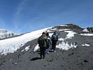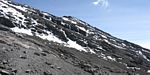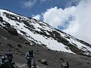 One of several hourly rest breaks for water and nibbles. | From well up on the side of Kibo the view down to the Barafu ridge (bottom centre) and the plateau to Mawenzi looks stunning. | Taking a closer aerial view of Barafu and Kosovo camps. | Above us the Rebmann Glacier looms ever more closely and majestically. | Closing in on the snow line as we get ever higher. |