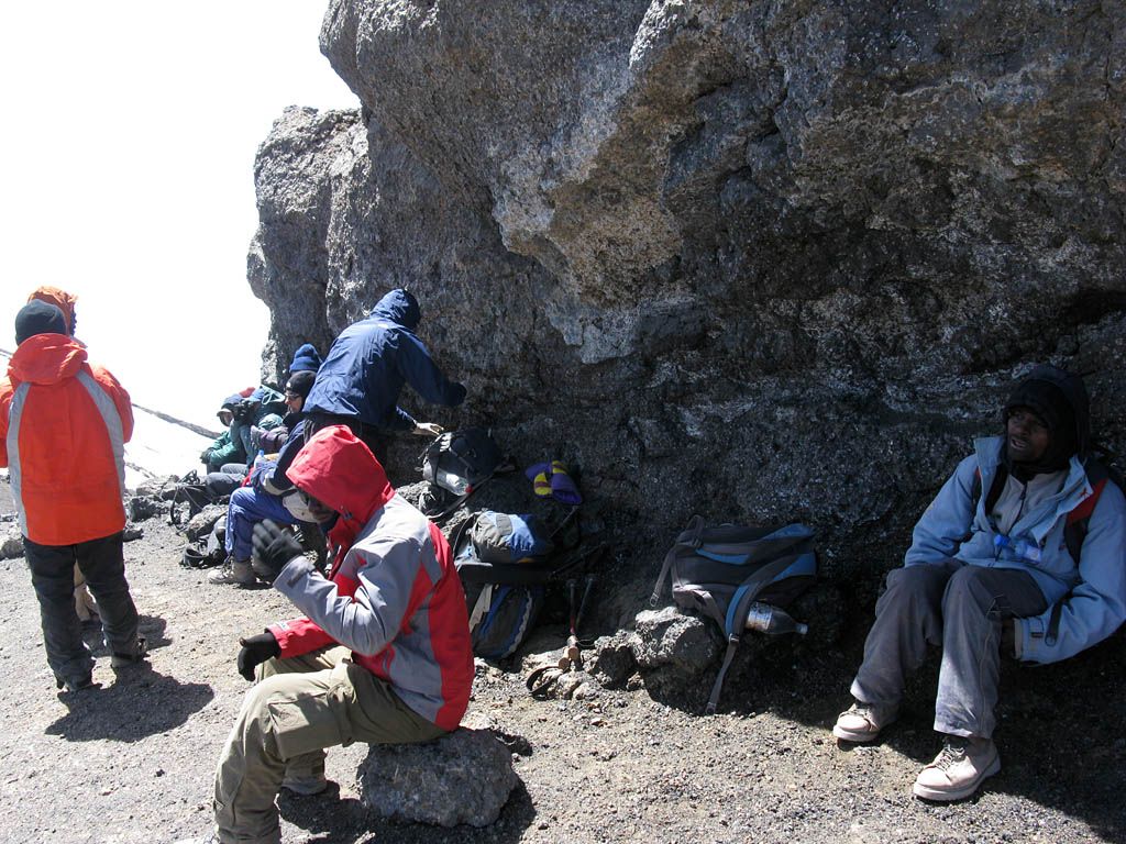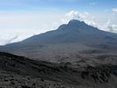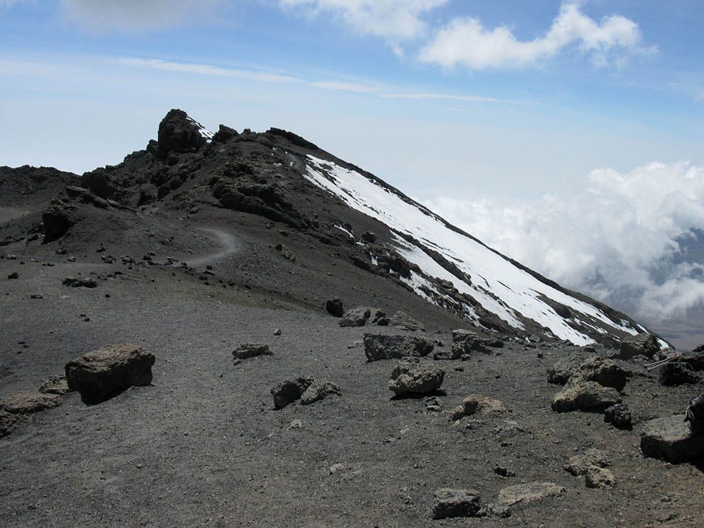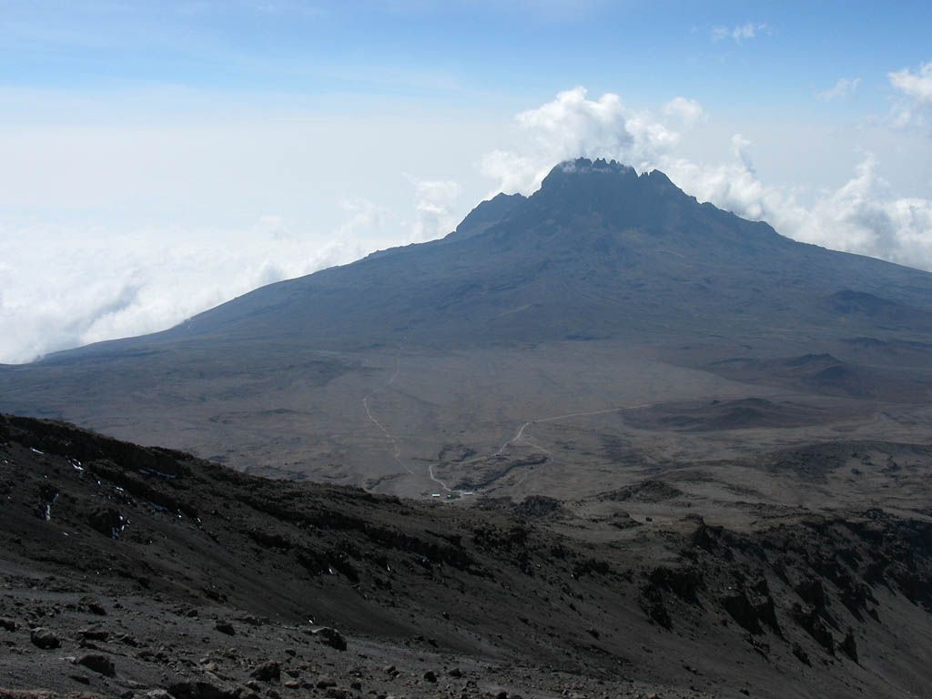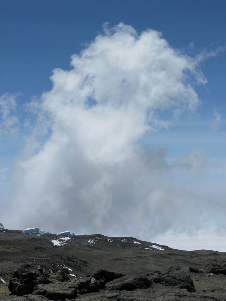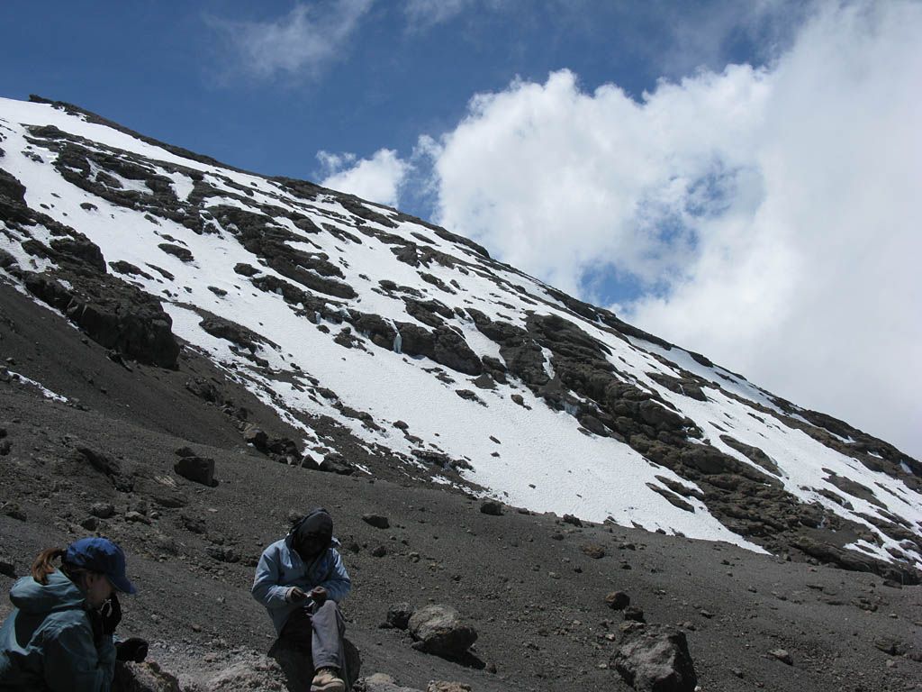 Pausing for food and drink as we drop back below the snow line. | Another view of the cloud line, its components twisting and churning in the breeze. Being so close to the cloud it all seems very dynamic. | Looking once more at Mawenzi as it gets framed nicely by the clouds. | Barafu Camp from the top of the slope just below Kosovo Camp. One more night to spend at Barafu before descending the Mweka Trail. |