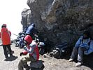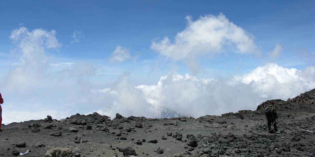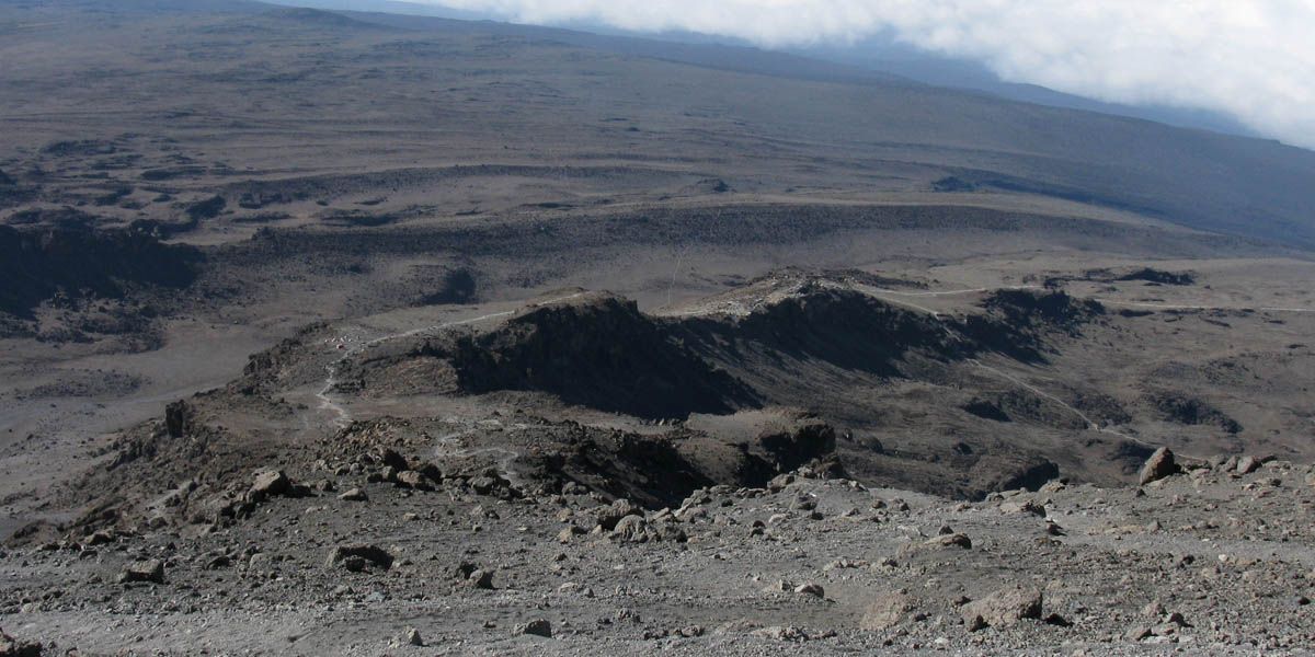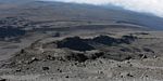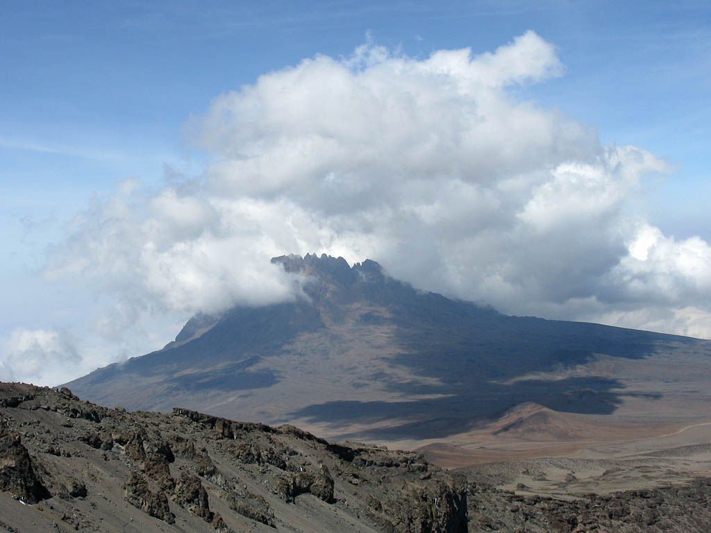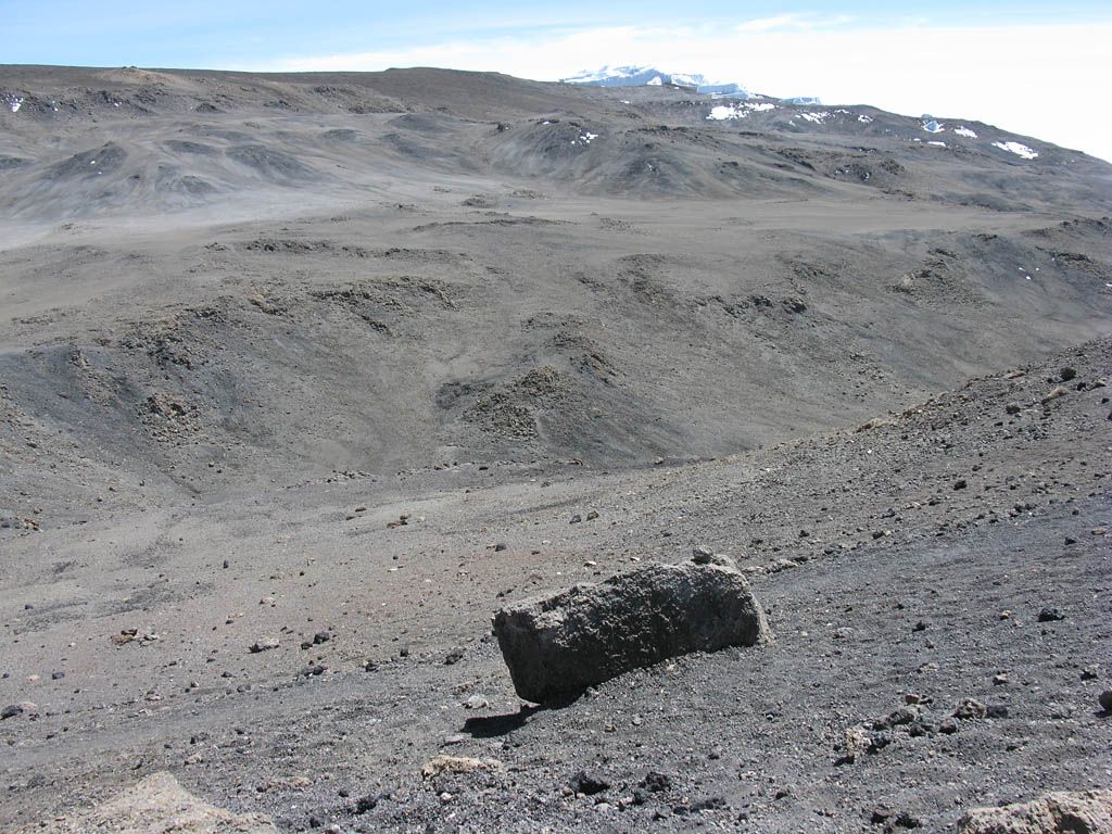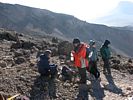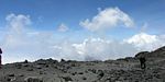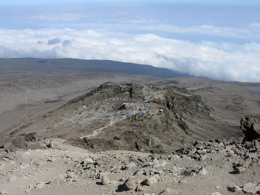 Pausing for food and drink as we drop back below the snow line. | Another view of the cloud line, its components twisting and churning in the breeze. Being so close to the cloud it all seems very dynamic. | Looking once more at Mawenzi as it gets framed nicely by the clouds. | Barafu Camp from the top of the slope just below Kosovo Camp. One more night to spend at Barafu before descending the Mweka Trail. |