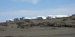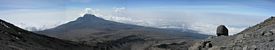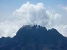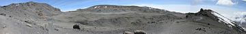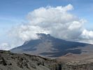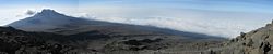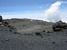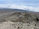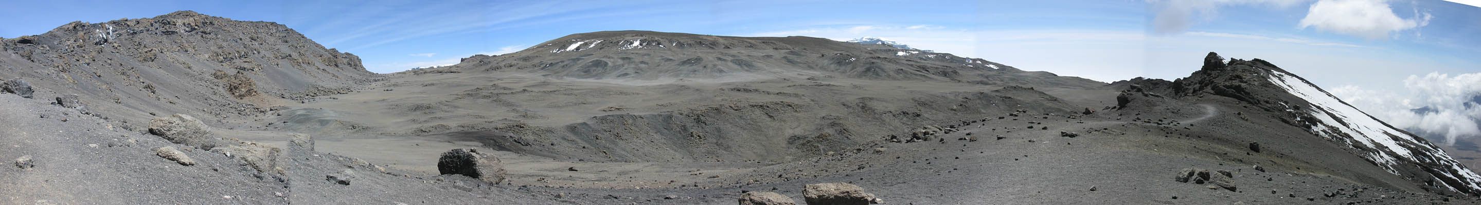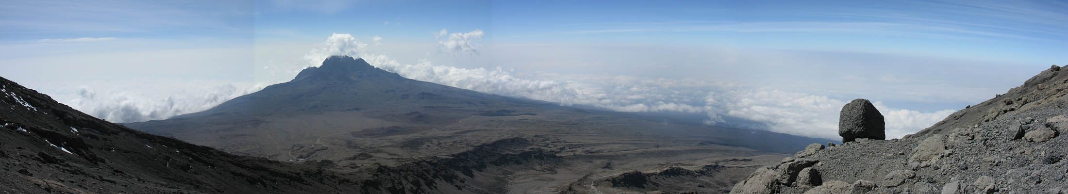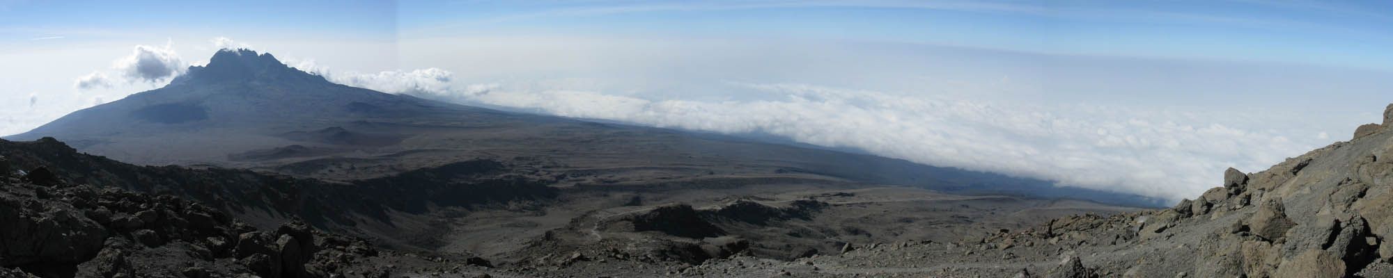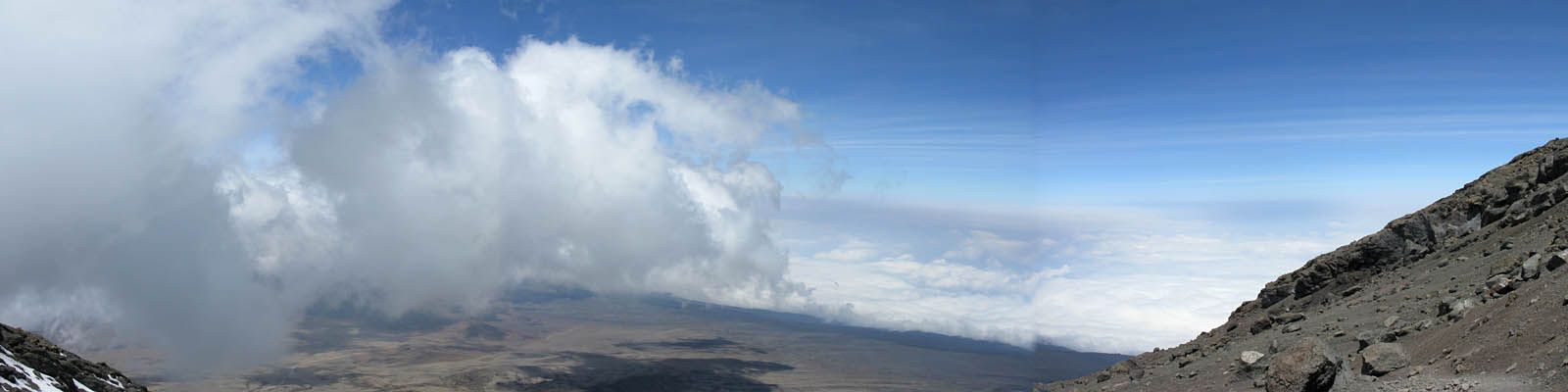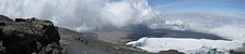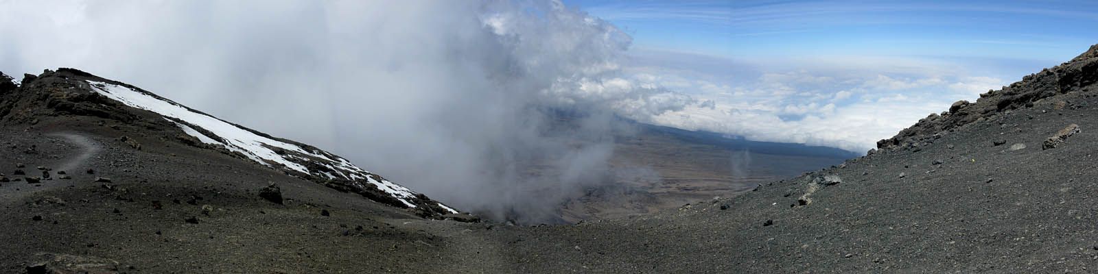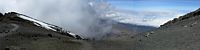 Clouds starting to form around the Mawenzi peak. | Looking down at Kibo hut on the Marangu route. | Another panorama from up at the snow line. Not far to Stella Point now. | Cloud formation on the Mawenzi plateau. |