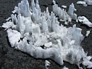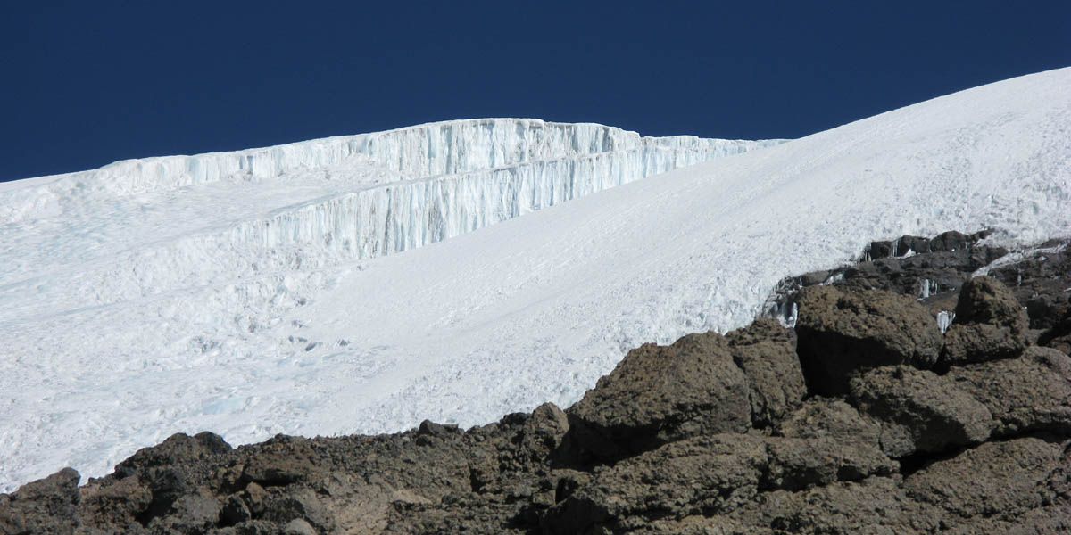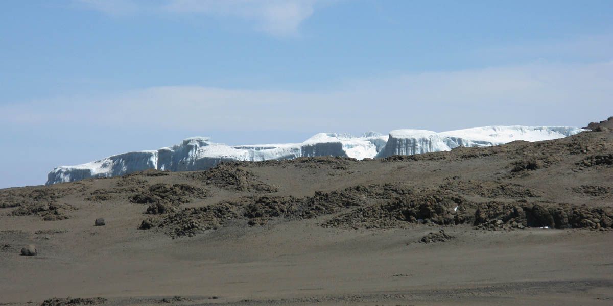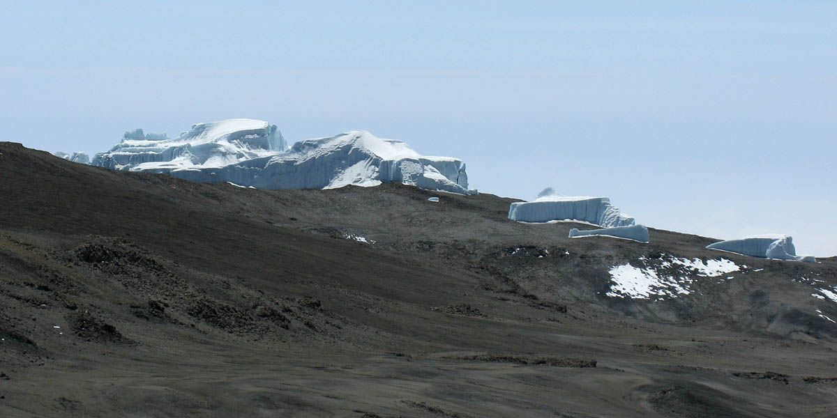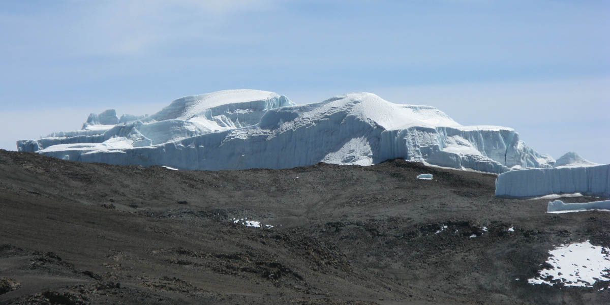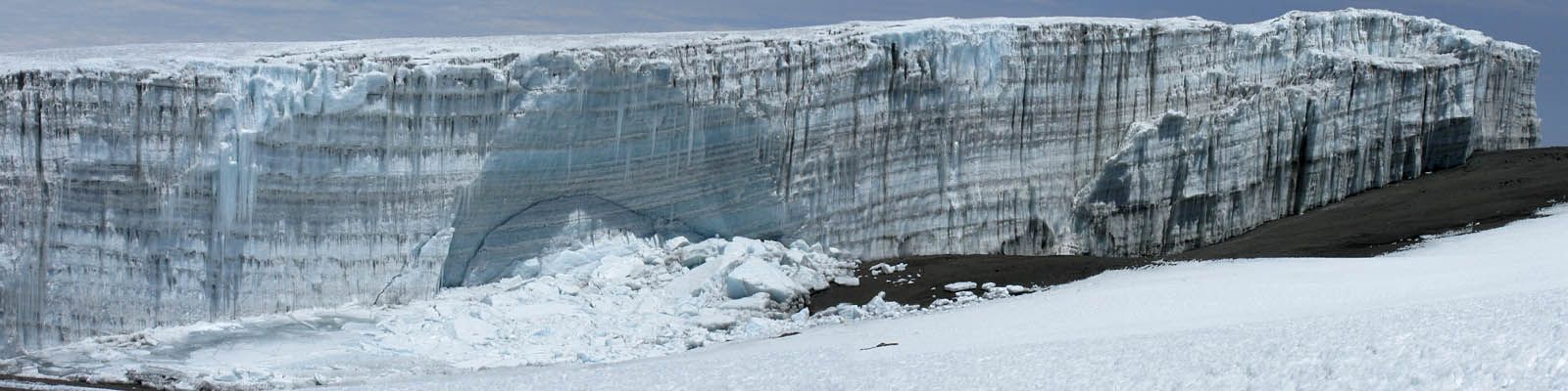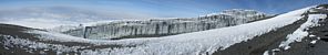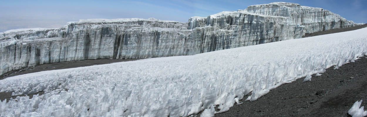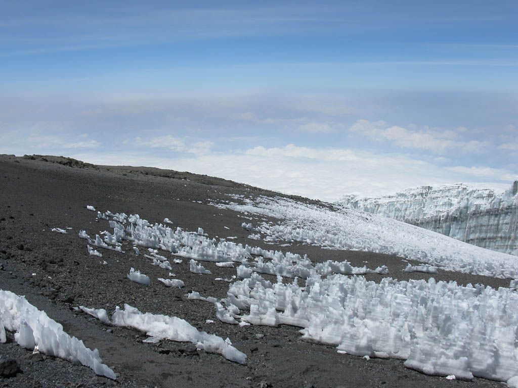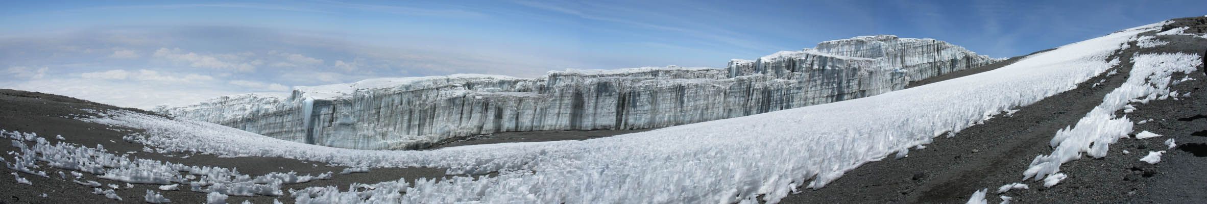 Panorama of Rebmann Glacier and the breathtaking view down as we walk towards Uhuru Peak. | Me in front of Rebmann Glacier. | Walking past strange ice formations. Presumably snow sculpted by the tropical sun, low pressure and icy wind into strange columns. |