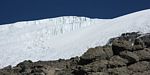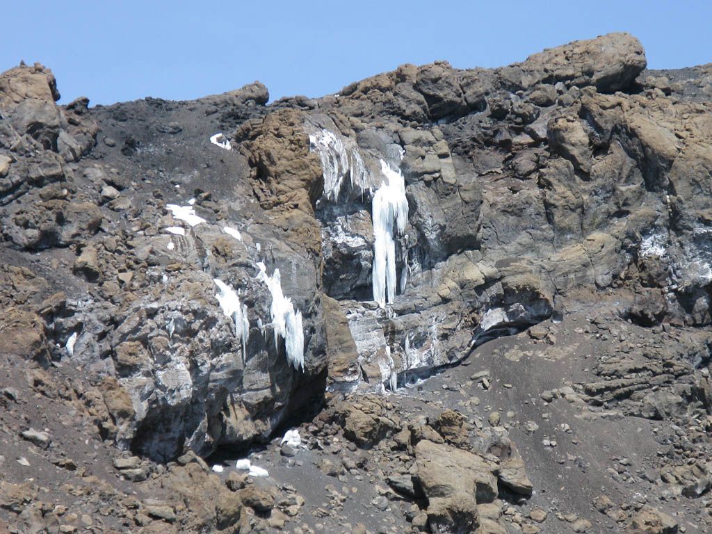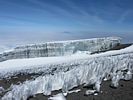 Icicles on the cliff below the Uhuru Peak area. | Furtwangler glacier from Stella Point. | Looking East to the Bismark Towers from Stella Point. The path comes from Gillman's Point where the Marangu and Rongai routes ascend. | Me on the crater rim at Stella Point. Hood up to shield from an icy cold wind. |
