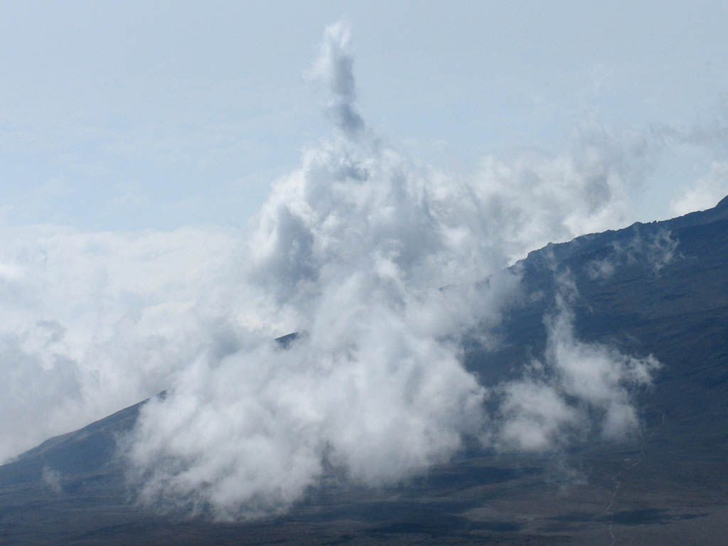 Two 360 degree panoramas attempted at the summit, one either side of the sign. The idea was to combine elements and produce a panorama without people or signs in the way. Alas it didn't come out well enough but both panoramas are still worth looking at, even with the defects and people in the way. In the first panorama Reusch Crater itself (right in the middle of the main crater) can just be seen (just right of the path inside the main crater) which is where present day activity is. Please don't ask what the guy in the orange jacket is up to in the right of the second panorama! |