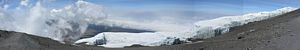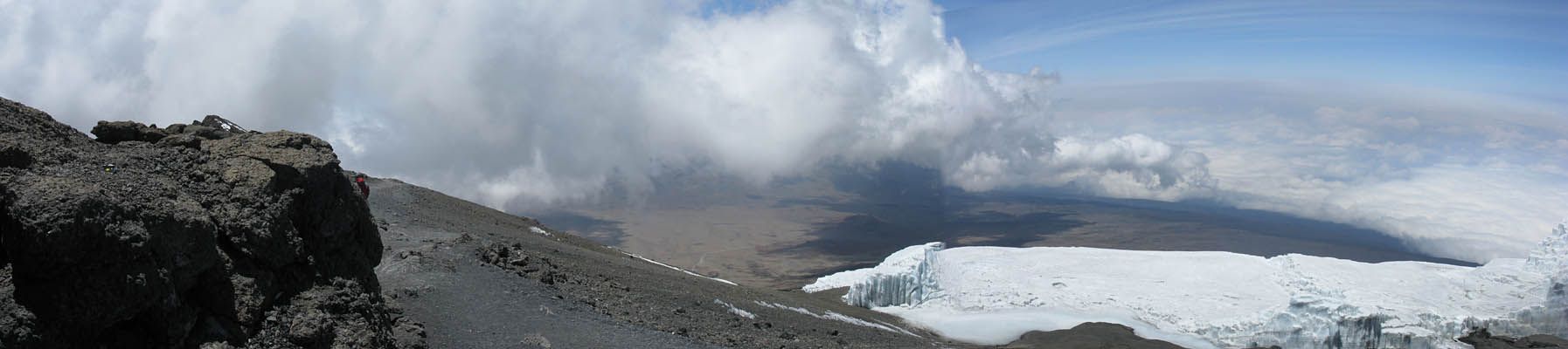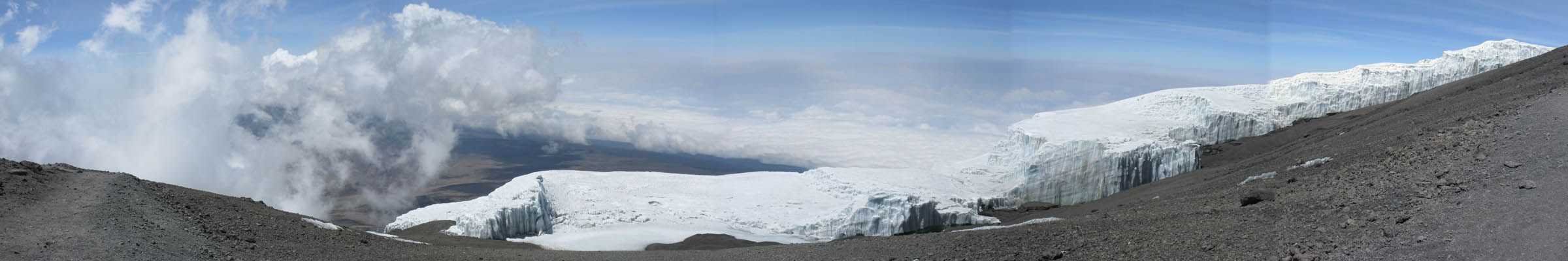 Two panoramas as we continue to walk above glaciers on the Southern Ice Field next to the crater rim. | Looking back Eastwards as we get higher and closer to Uhuru Peak. | Another view across the ice and high over the clouds. | Looking across the crater to the Eastern Ice Field. |