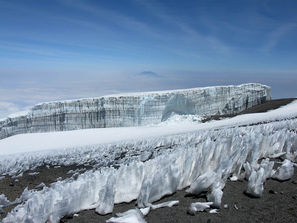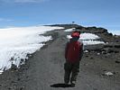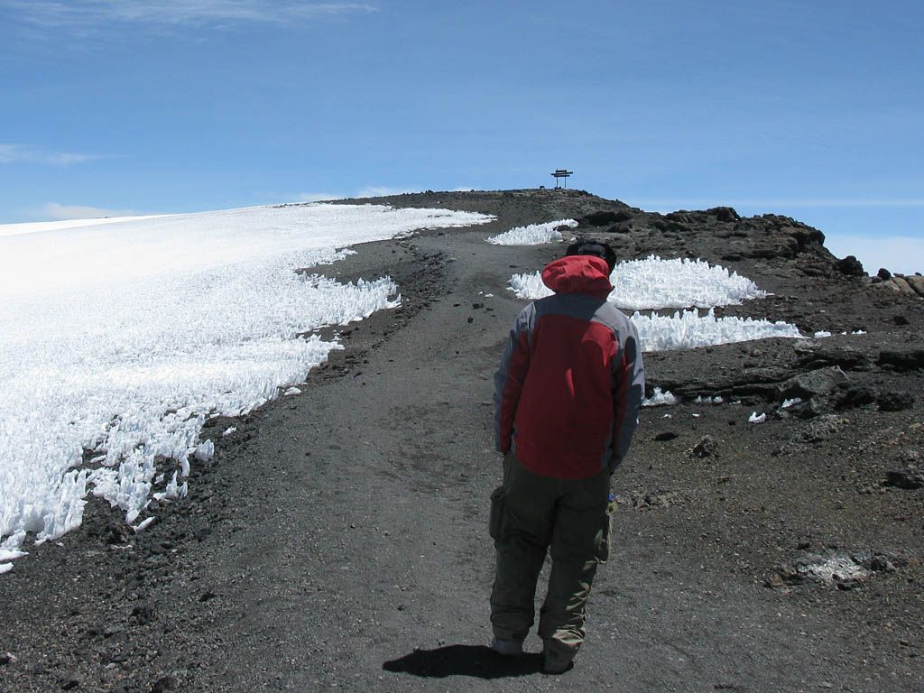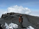 This is probably 'The Wedge'. A spectacular glacier. With me in front, a view hilighting the ice columns in front, and a panorama that shows up the layers in the ice very well as well as icicles under a collapsed section. | Mount Meru from close to Uhuru Peak. Even this mountain looks small now from this height. | Nearly there! The Uhuru Peak sign comes into view! |