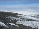 After the rest we proceeded clockwise around the crater rim past the Southern Ice Field glaciers, which were now below us instead of prominently way above us as from Barafu Camp and much of the way up. Close up they were majestic cathedrals of ice, some showing intricate layering. The further round we got, the more ice there was off the path, forming these intricate columns, no doubt sculpted by the low pressure, wind and tropical sun. The path itself though remained ice free and dry all the way round. In fact the weather as a whole was more pleasant up here than down at Barafu. It seemed like we had climbed above the weather that was causing the powerful and unpleasant gusts of wind at Barafu. There were some exposed spots where the wind picked up and being below freezing that was quite bitter. But even at the summit it wasn't that unpleasant. Still with the cold and ice, it was hard to believe we were only three degrees south, although the midday sun being almost directly overhead kept us real there. Under foot the scree was so dark and alien that it did at times seem like we were on an alien world.