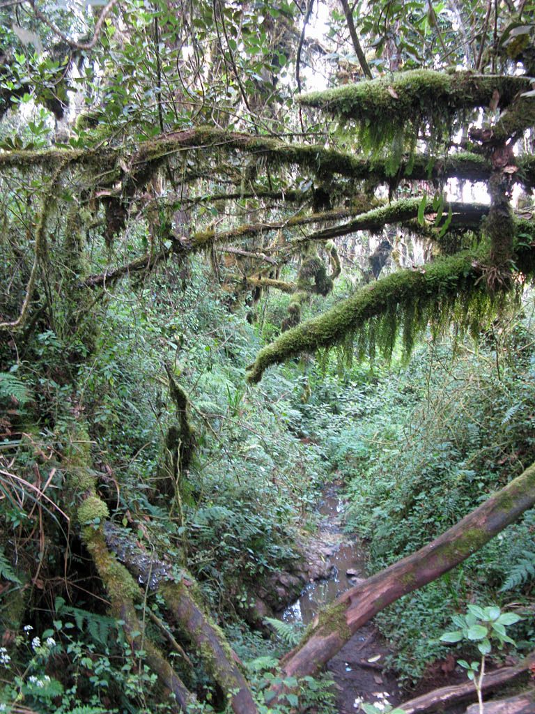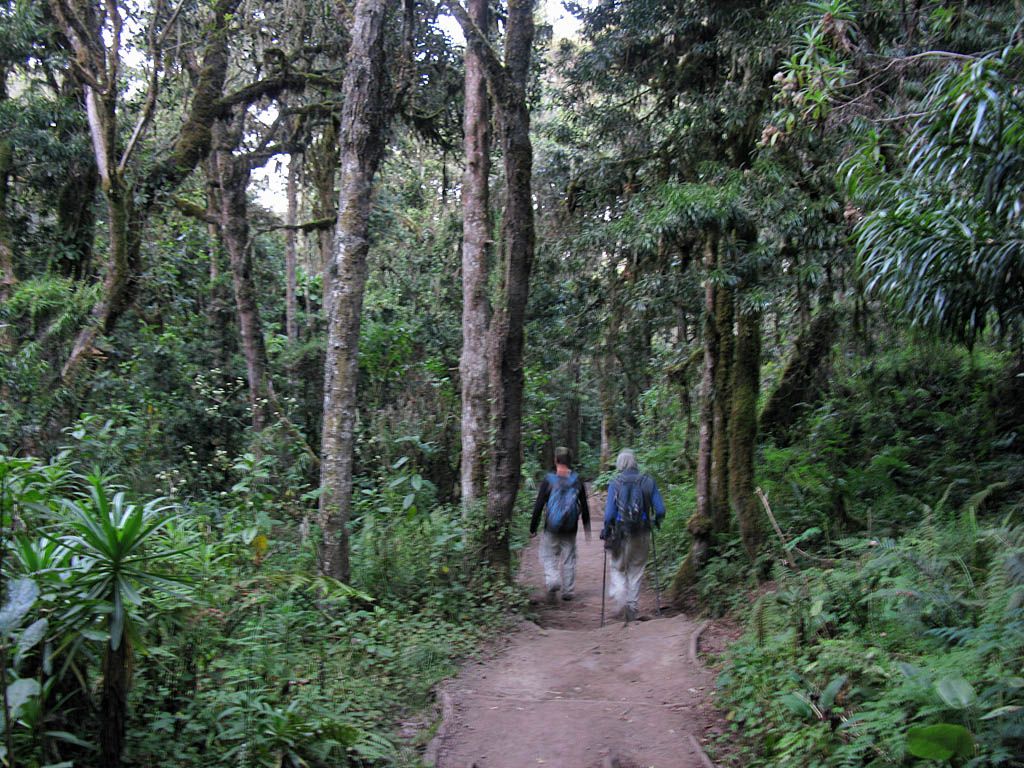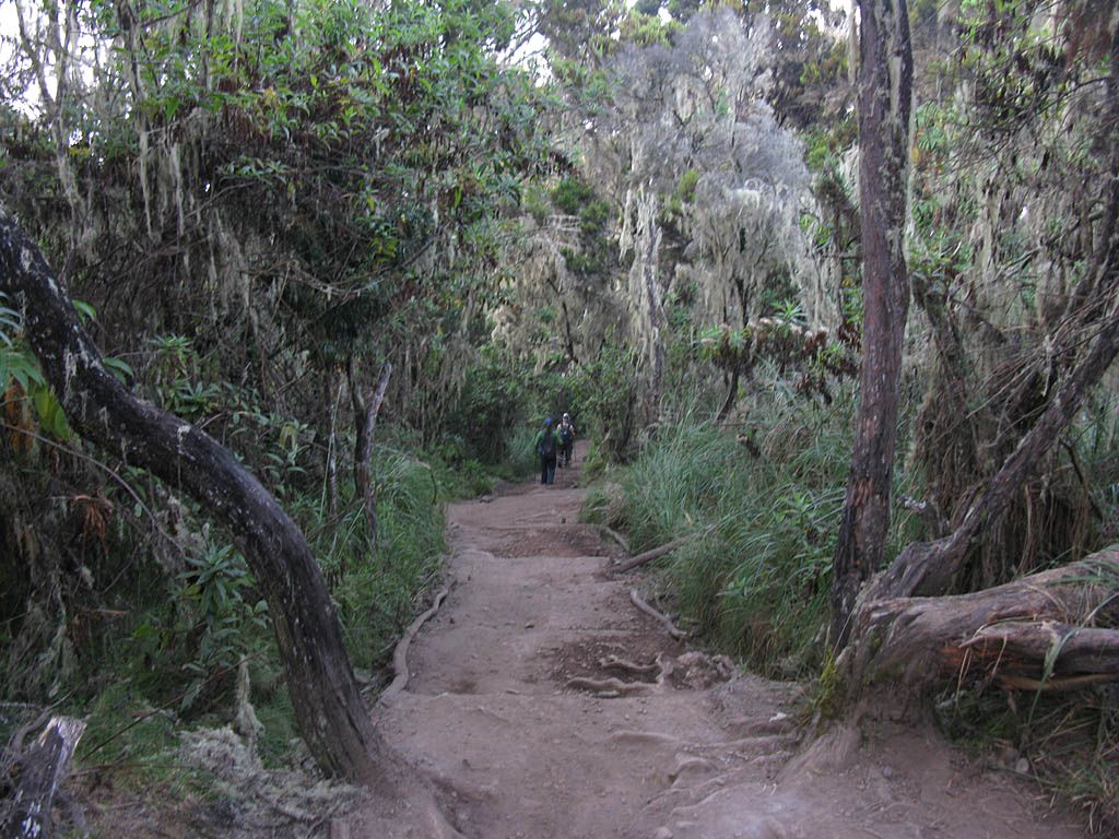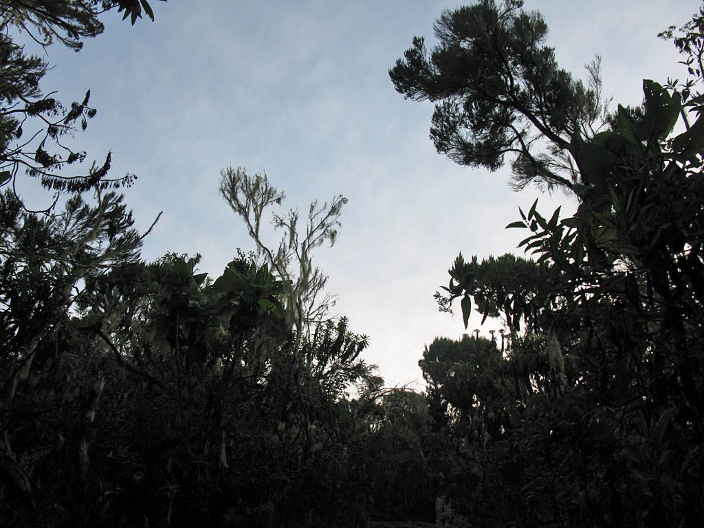 We got up at 5:30AM as planned, and packed everything away. It was goodbye to the tent for the last time as it got packed away to be taken off the mountain. We had breakfast at 6AM as the dawn light brightened, and started walking at about 6:40AM. Light levels were very poor but the forest trail was indeed very pretty. Just five minutes out of Mweka Camp the tree line was abruptly reached, with the giant heathers being swapped for increasingly large trees. Despite the poor light levels I managed to take plenty of pictures, including macros shots of flowers. Challenging in the low light mind you, and a number of them failed to come out or the flash, when used, washed them out too much. Below is a selection of the ones that did come out atleast.