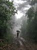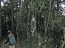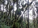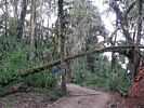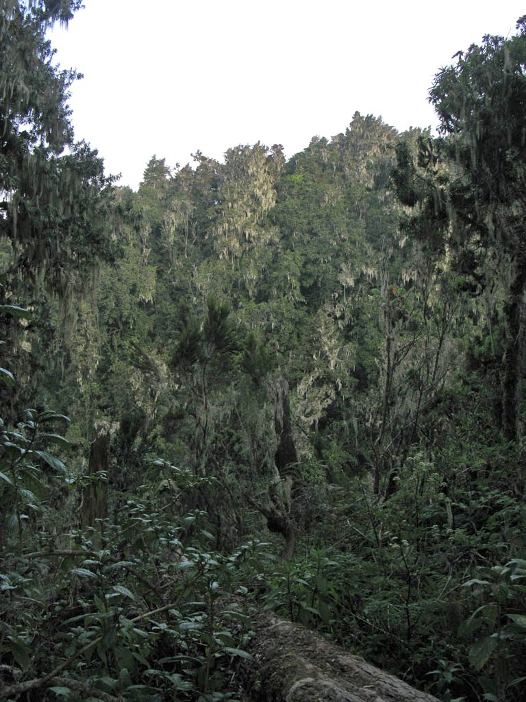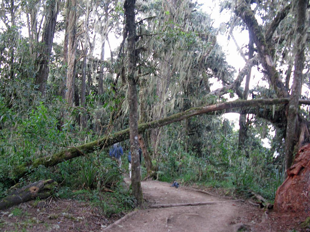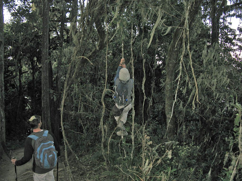 Leaving Mweka Camp early. | Round the corner from camp is the tree line and a sudden change from giant heathers to forest trees, all draped with Old Man's Beard. Light levels were poor as we descended into the clouds that we had watched from high above for days. The trees are particularly tall on the South side of the mountain with plenty of sunshine and moisture. | Yedidya attempting to climb a vine. Picture taken just before the vine broke sending him crashing to the ground! |