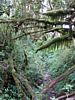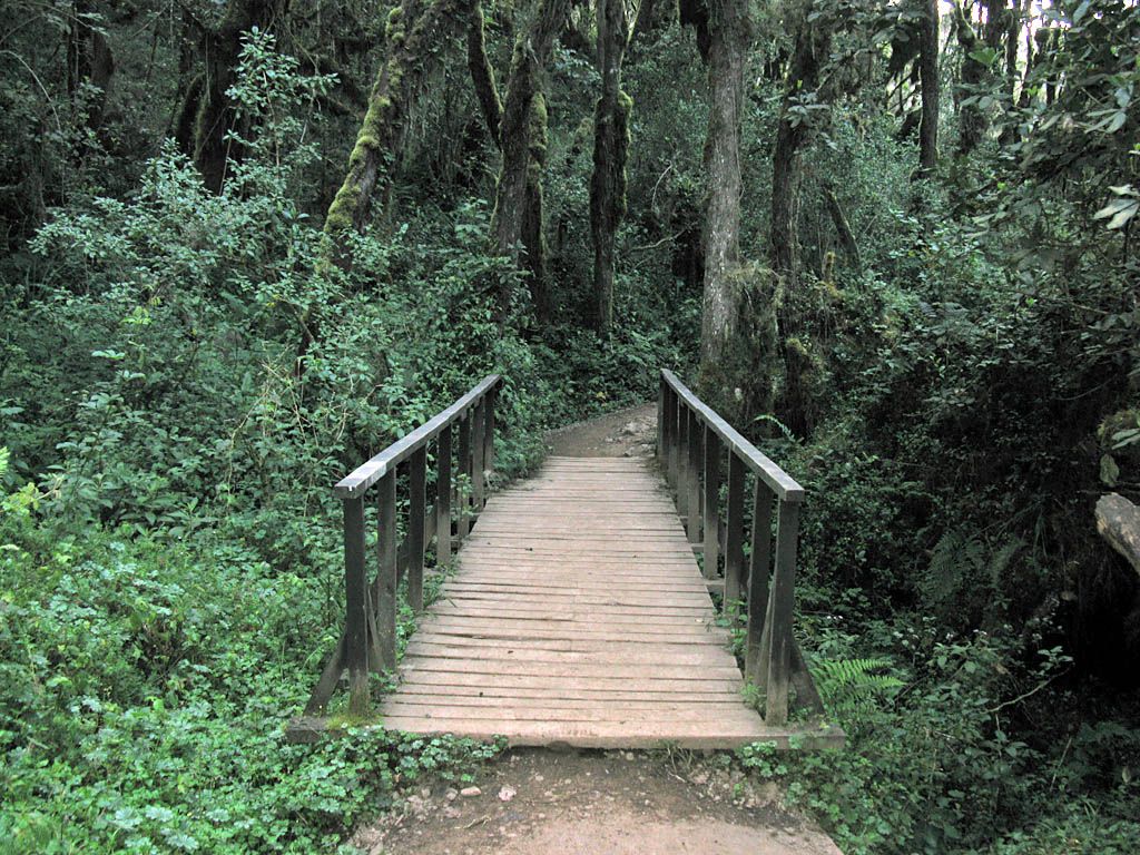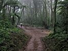 Looking up and down the worn out and overgrown path as we cross the bridge. | More moss. | We are definitely in the cloud now, and it is starting to rain too. | *TODO* Identify | Reaching the four wheel drive track to the Mweka Gate, now in heavy rain. |
