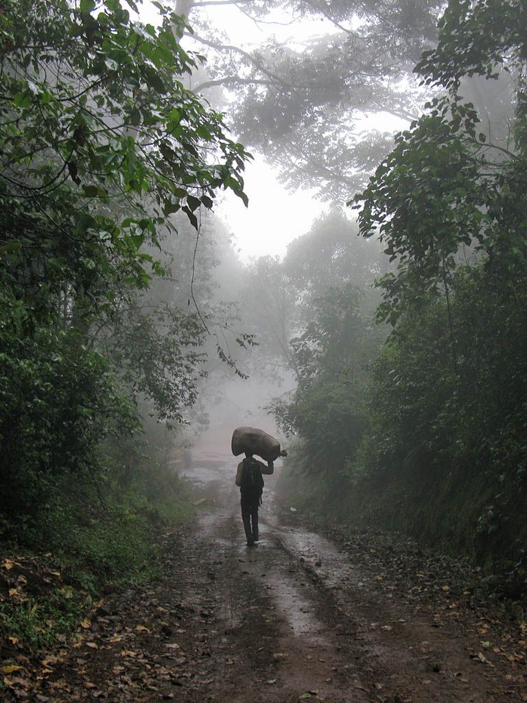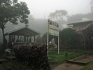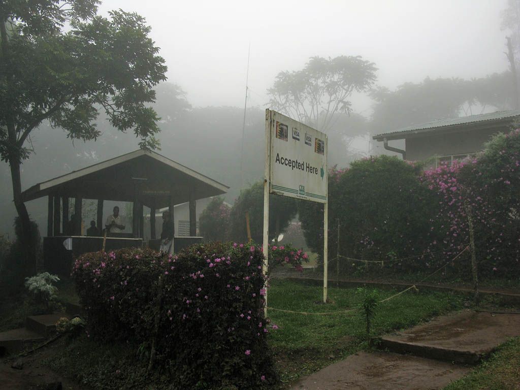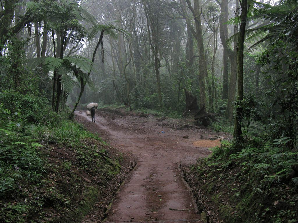 Eventually the trail ended and the four wheel drive track started. In contrast to the trail, the track was horrible, with deep ruts and loads of very slippery mud. I very gingerly slip-slid my way down the hill, trying to stay on top of the ruts in the smoother spots. Somehow I managed to avoid going sideways, and after what seemed like an age the Mweka Gate loomed into view through the rainy fog.