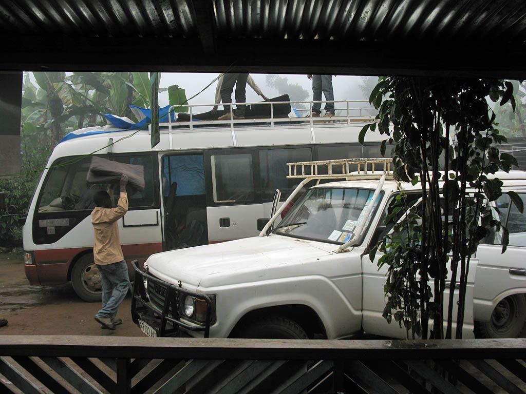 *TODO* Identify | Following a porter along the four wheel drive track in heavy rain. | Civilization! We reach the Mweka Gate and the end of the trek. | Our gear being packed onto the bus ready to return to Karama Lodge. | A delicious farewell meal and drinks being served by the chef from the trek. |