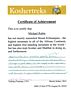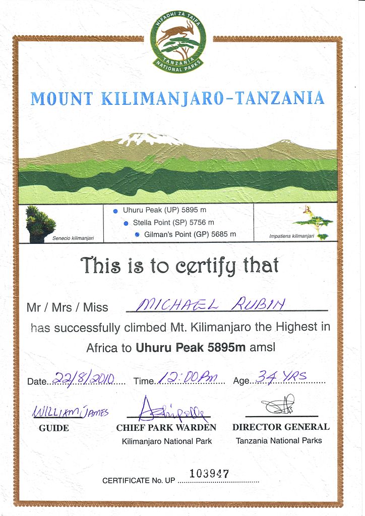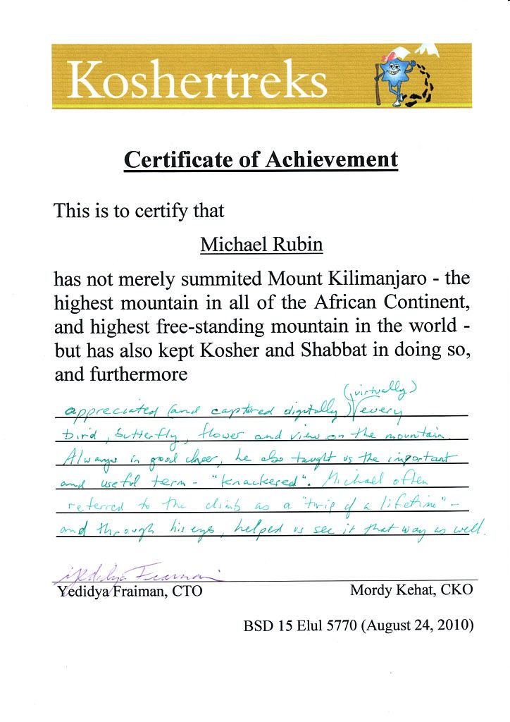 The Tanzania National Parks certificate certifying my achievement of reaching Uhuru Peak. | The Koshertreks certificate. | The Koshertreks T-shirt including a zoom in on the logo. |