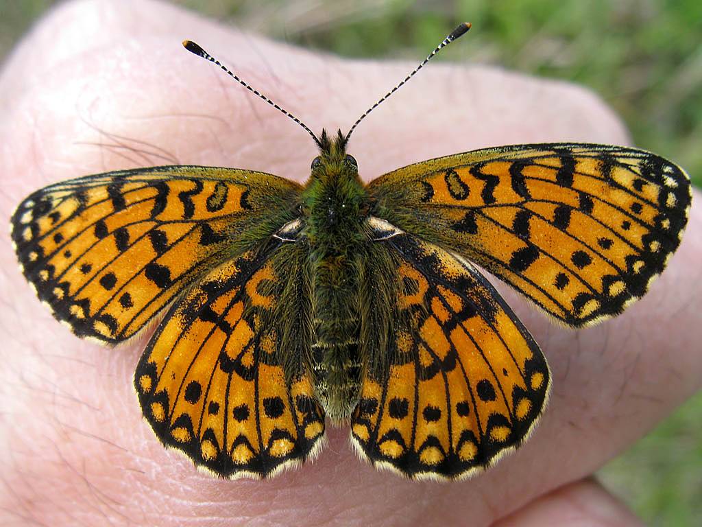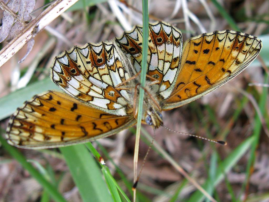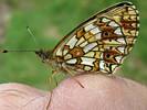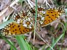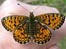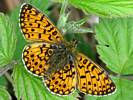Four closeup pictures of a Small Pearl Bordered Fritillary. | The scrubby hill, Crag Head, West-southwest of Loughrigg Tarn which the fritillaries call home. |