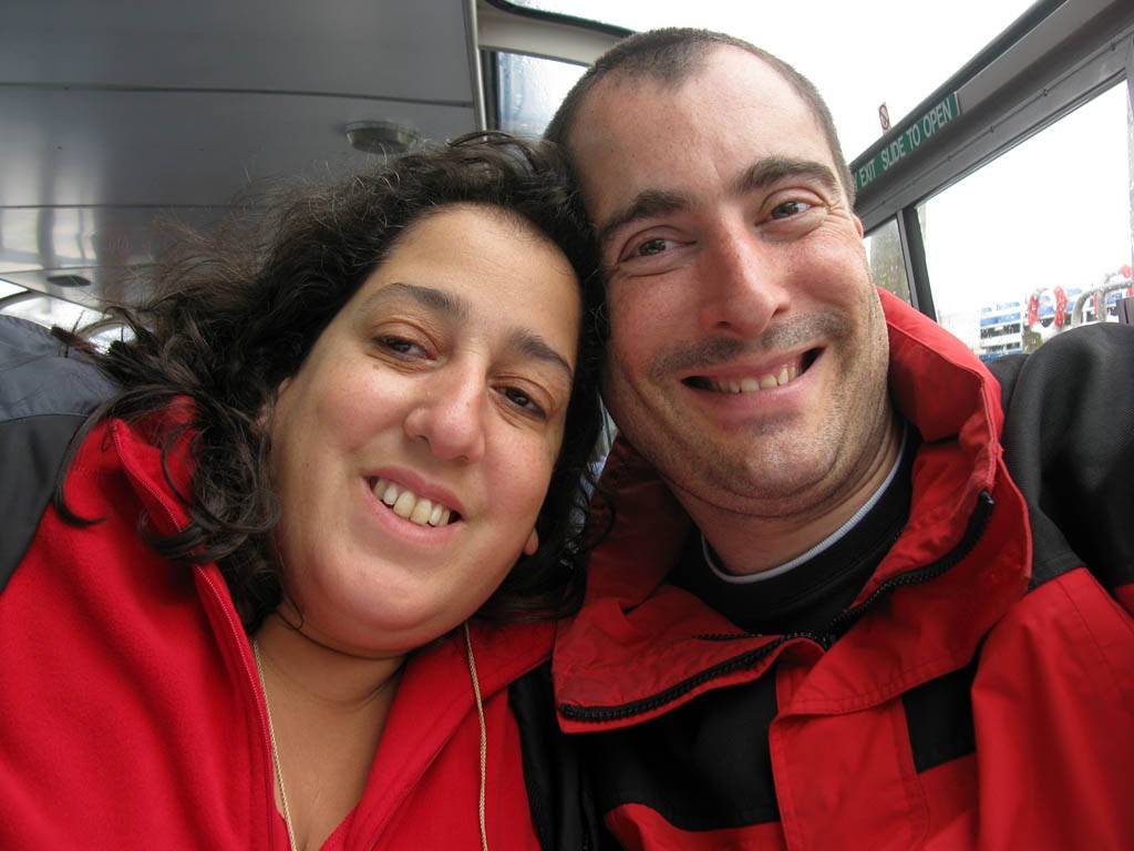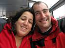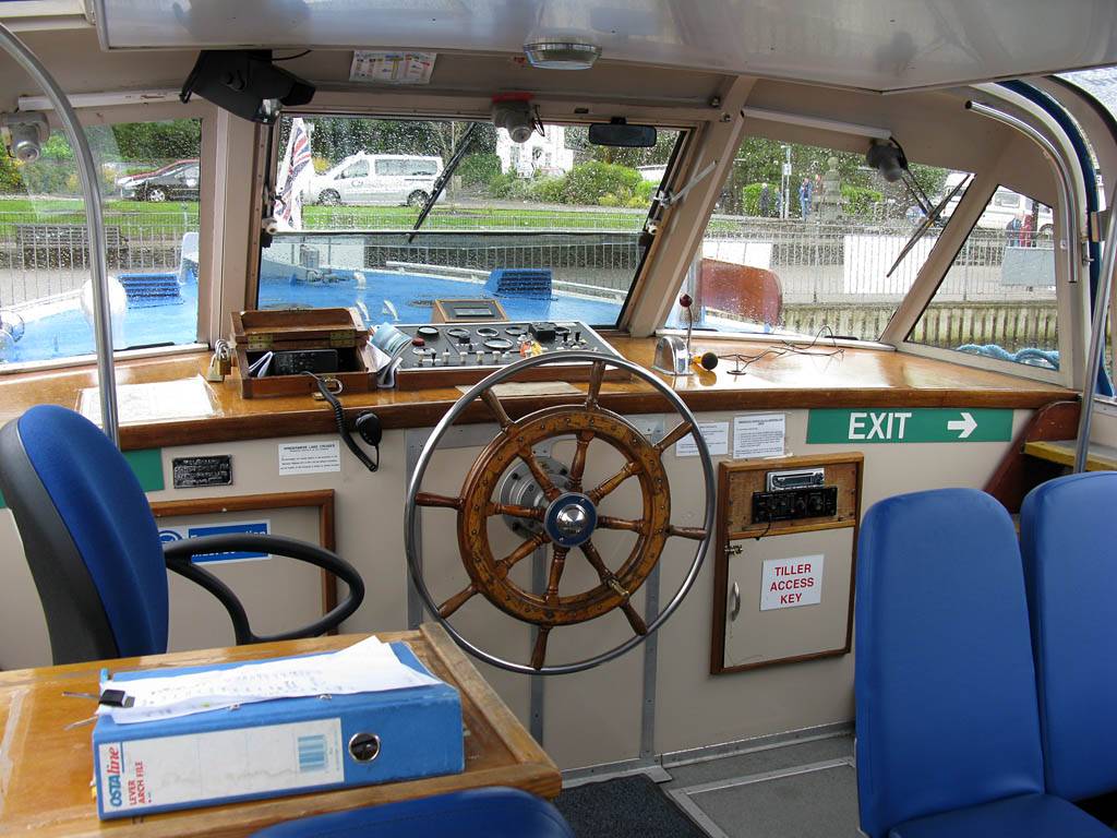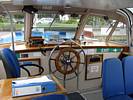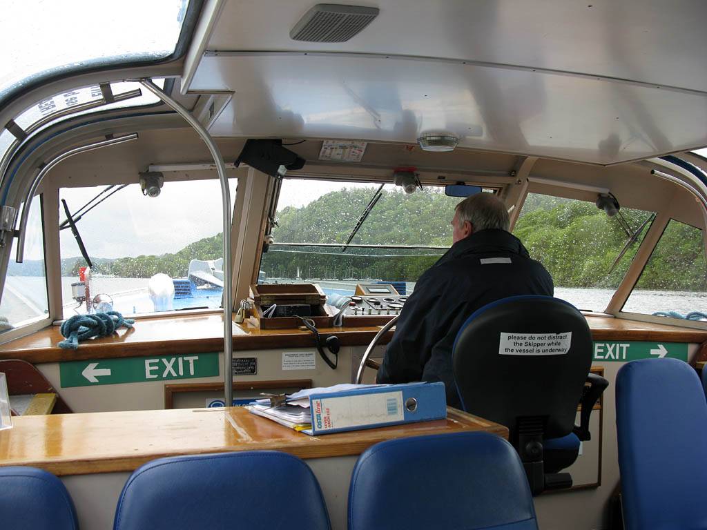 Renée and Mike on the cruise boat. | The skipper's bridge. | Departing Bowness and surrounded by parked boats. |