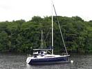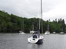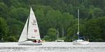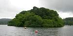 The skipper at work. | Posh places along the shore of Windermere. | One of many small islands in the centre of Windermere. | Boats sailing on the lake. | Looking back from where we came. |