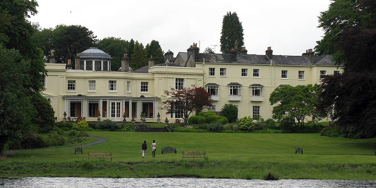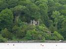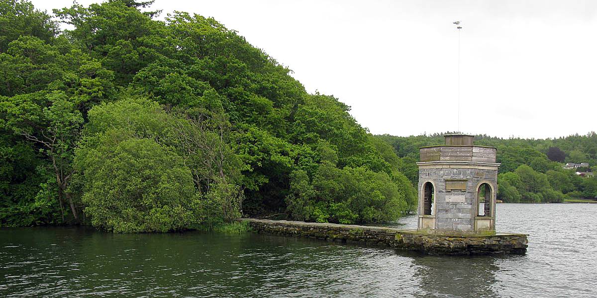Looking ahead as we cruise southwards. | A Victorian lookout point on the West side of the lake. | Carrying on southwards and enjoying the moody view. | Storrs Temple and Storrs Hall hotel. |