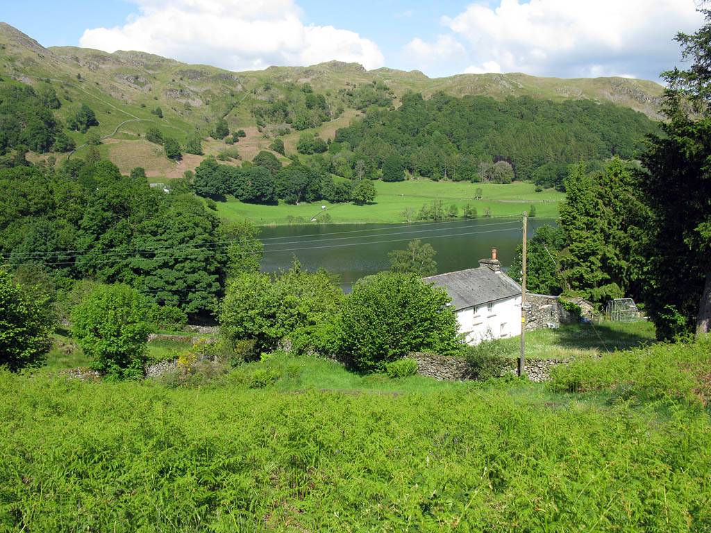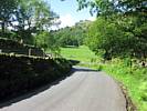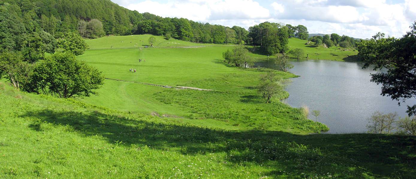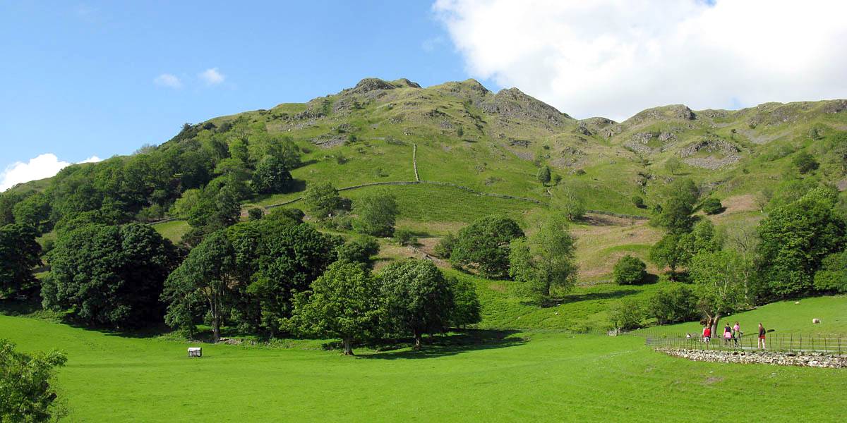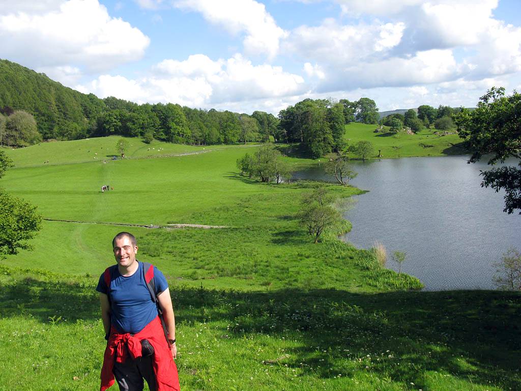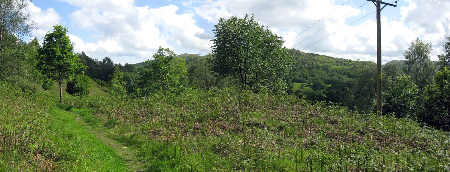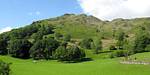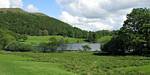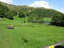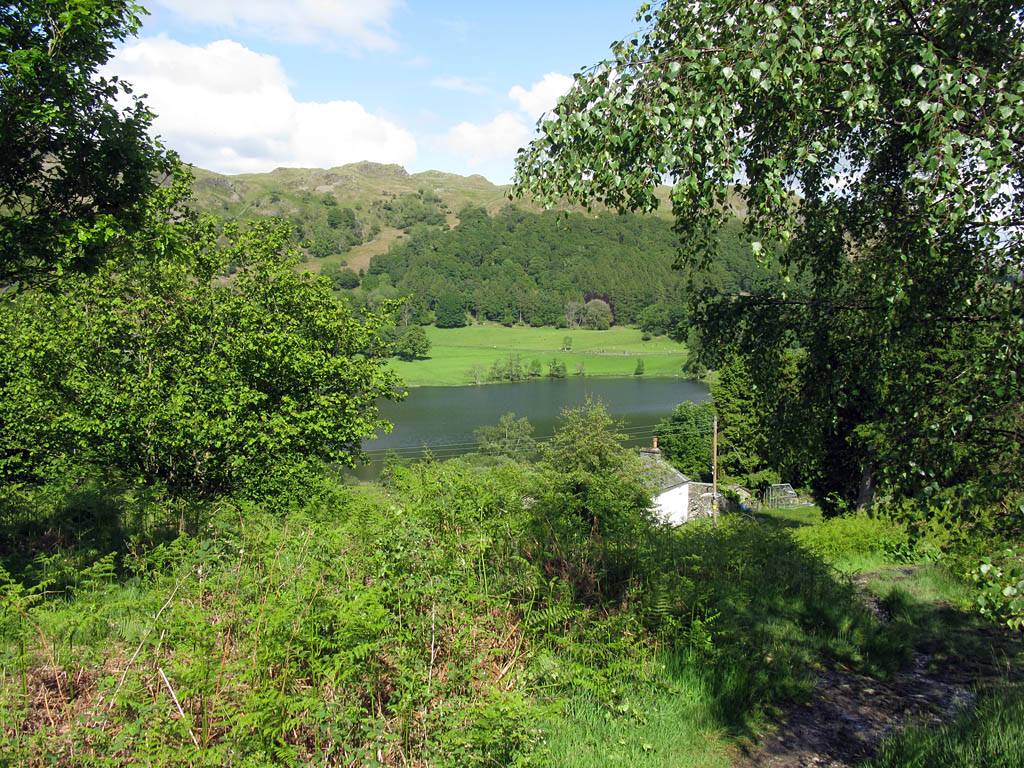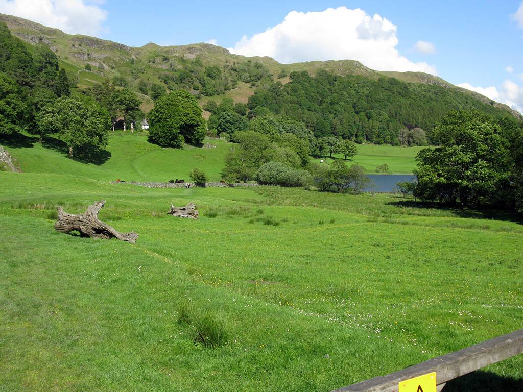 Another view on Crag Head. | Loughrigg Tarn comes into view as we descend from Crag Head. | The minor road that skirts past the Southwestern side of the lake. | Crossing the first lakeside field after the road. |