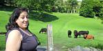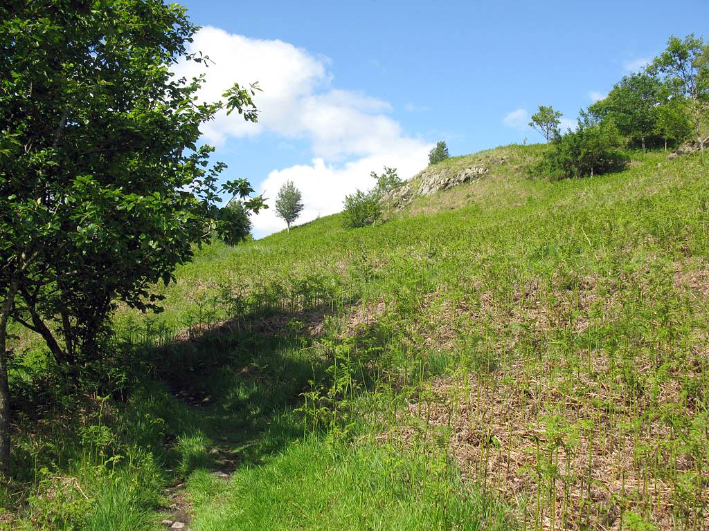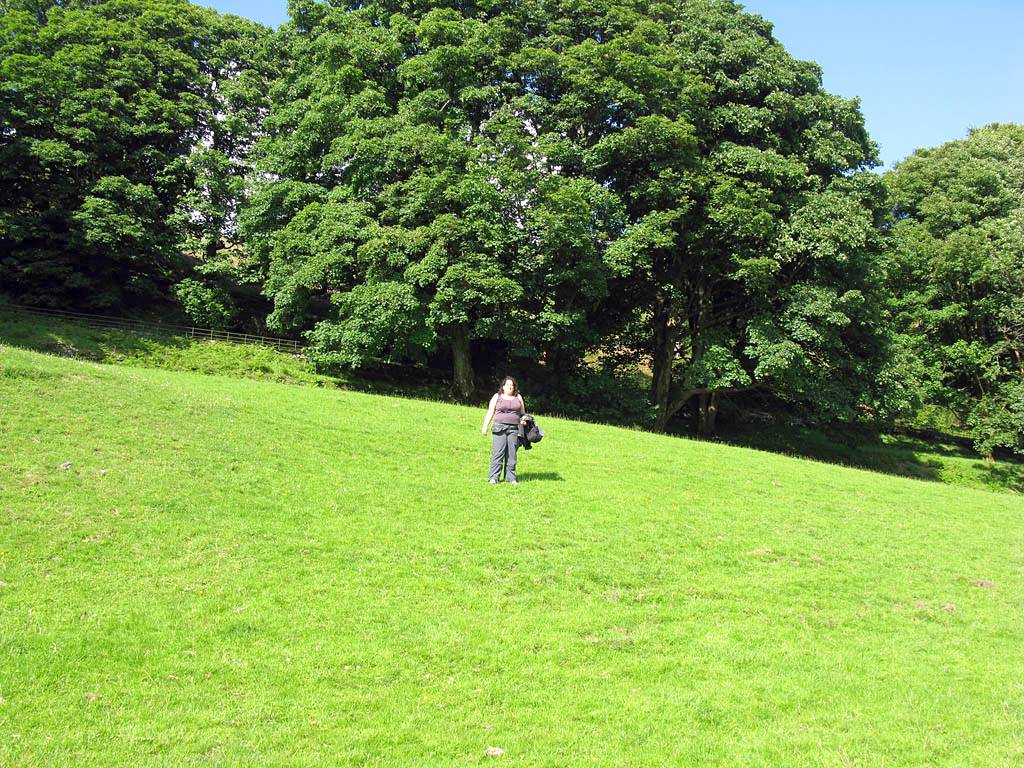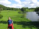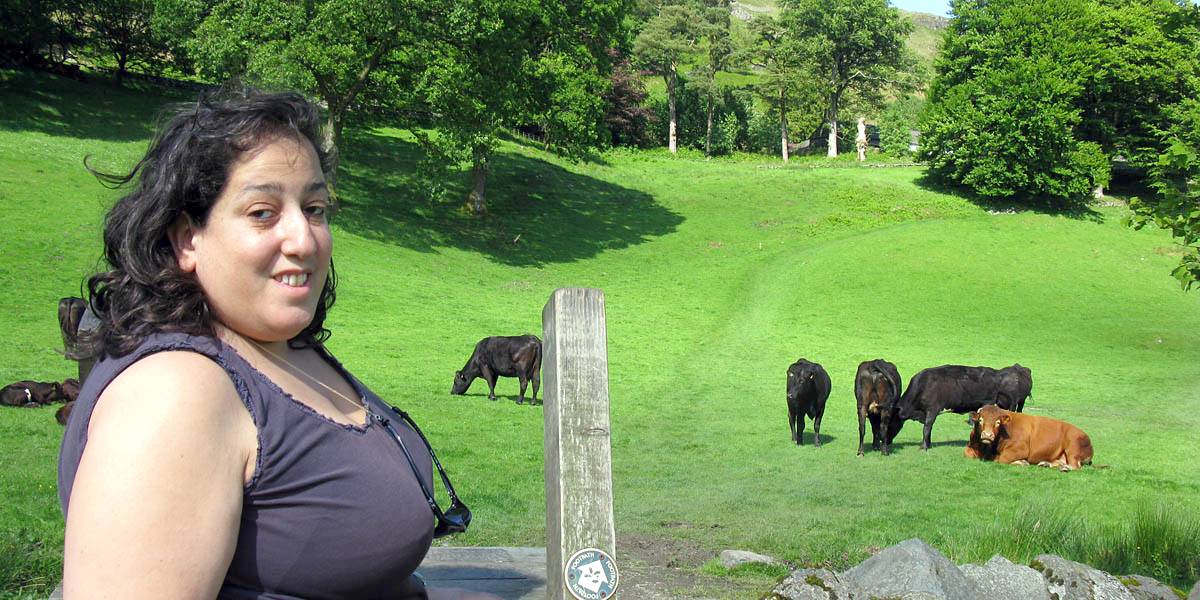 Looking back after we pass the gate and escape up the hill. Soon after the cows move and block the gate. | Looking along the northern side of the lake. | Renée on the small hill above the cows. |