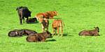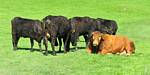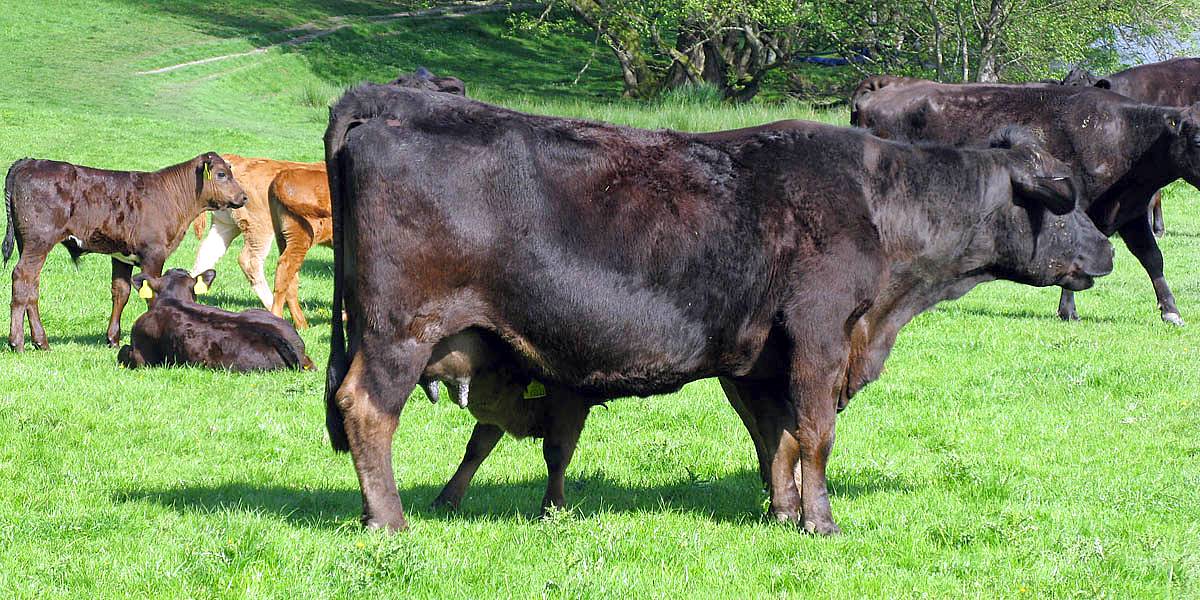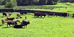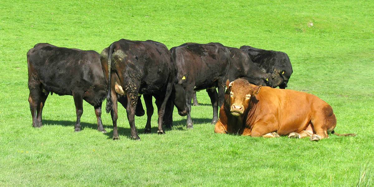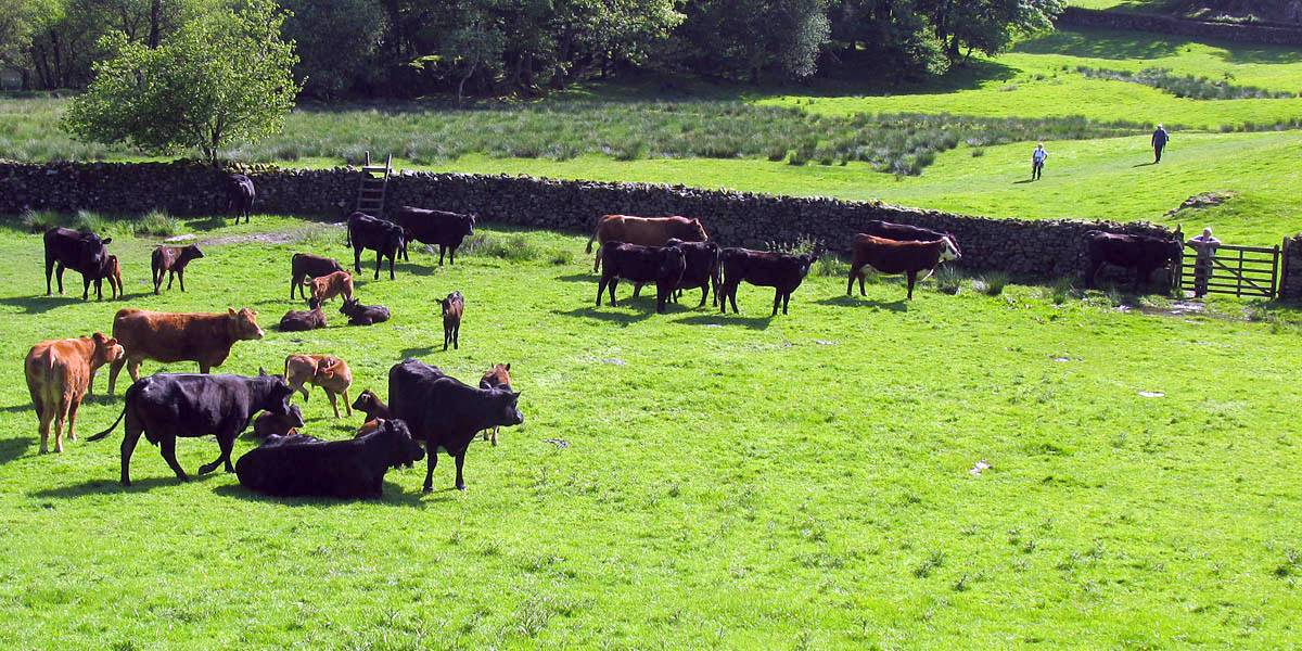 Cows on the other side of the wall in the next field. | Renée on the style over the wall with the cows behind. | A calf suckling and the bull clearly in charge. |